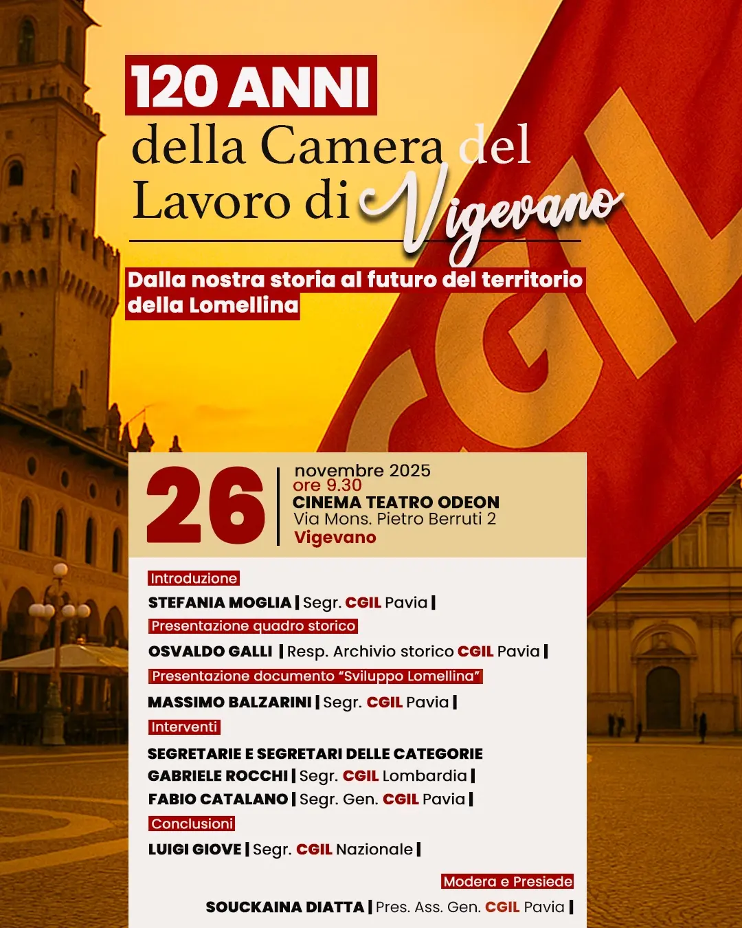 Il segretario confederale della Cgil Luigi Giove concluderà l’iniziativa promossa in occasione dei 120 anni della Cgil di Vigevano ‘Dalla nostra storia al futuro del territorio della Lomellina’. Appuntamento mercoledì 26 novembre presso il Cinema Teatro Odeon di Vigevano in via Mons. Pietro Berruti n.2, ore 9.30.