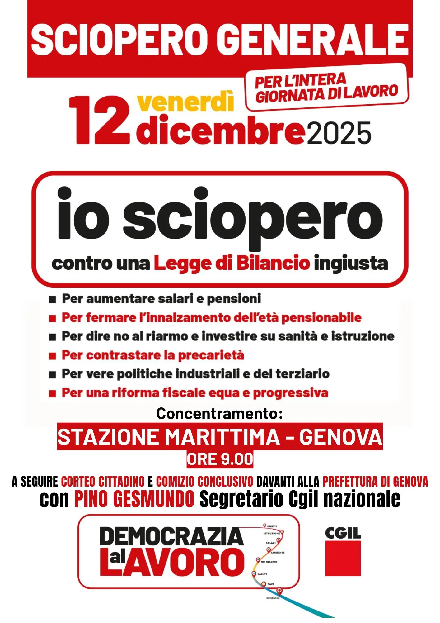 Il segretario confederale della Cgil Giuseppe Gesmundo concluderà la manifestazione a Genova in occasione dello sciopero generale per l'intera giornata di lavoro proclamato dalla Confederazione contro una Legge di Bilancio ingiusta. Concentramento venerdì 12 dicembre presso la Stazione Marittima a Genova, ore 9.00, a seguire corteo cittadino e comizio conclusivo davanti alla Prefettura di Genova in Largo Lanfranco. Per informazioni clicca qui