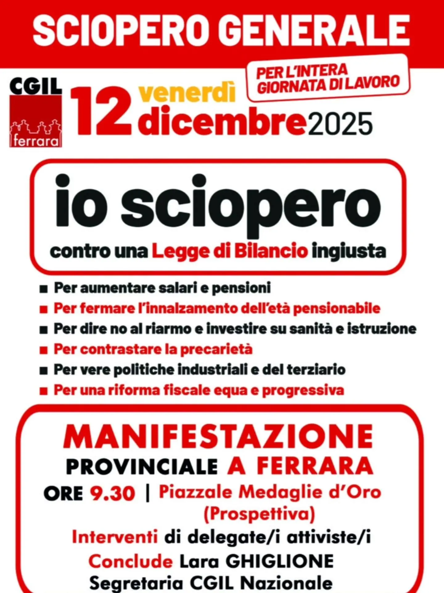 La segretaria confederale della Cgil Lara Ghiglione concluderà la manifestazione provinciale a Ferrara in occasione dello sciopero generale per l'intera giornata di lavoro proclamato dalla Confederazione contro una Legge di Bilancio ingiusta. Appuntamento venerdì 12 dicembre in piazzale Medaglie d'oro (prospettiva), ore 9.30. Per informazioni clicca qui