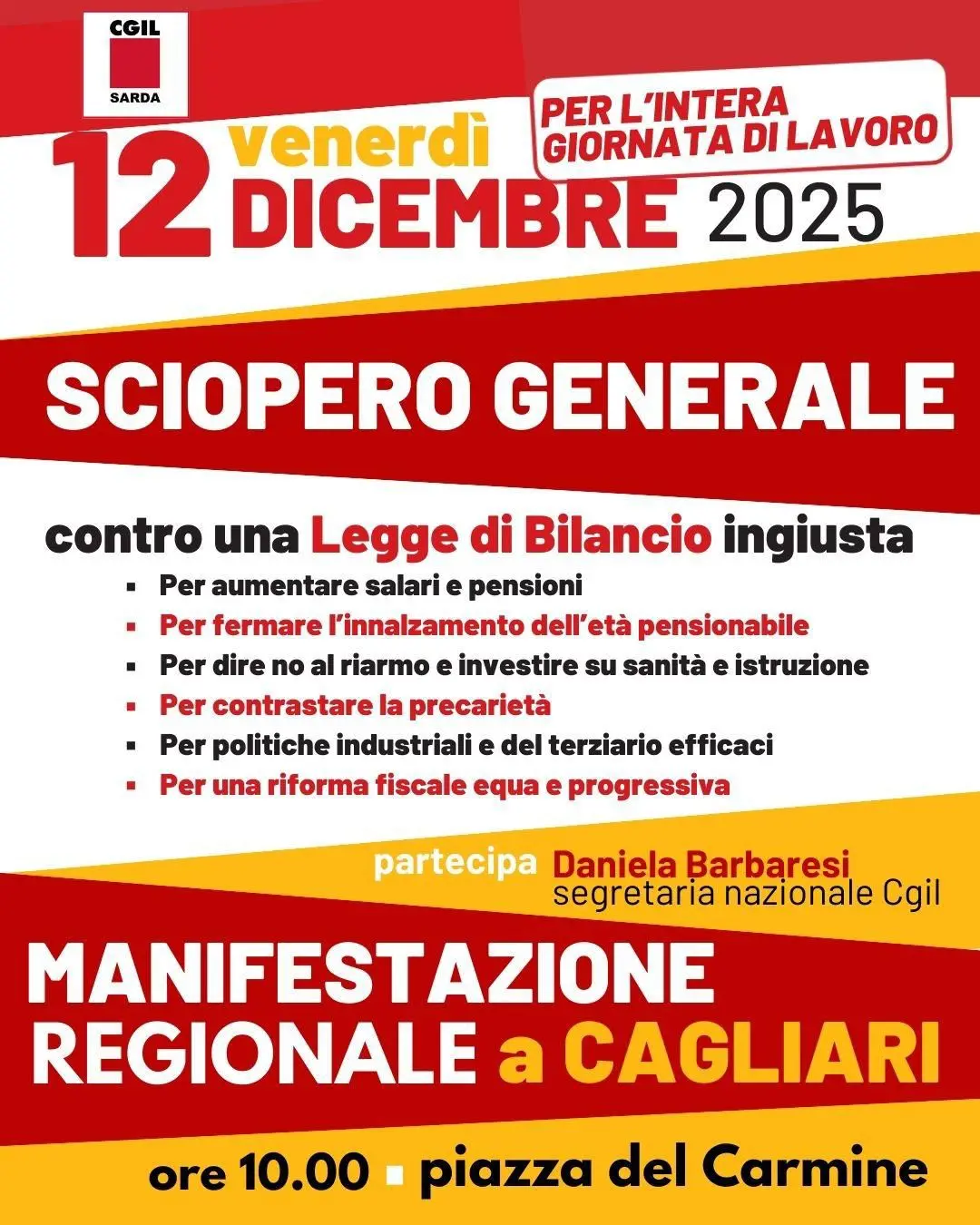 La segretaria confederale della Cgil Daniela Barbaresi parteciperà alla manifestazione regionale a Cagliari in occasione dello sciopero generale per l'intera giornata di lavoro proclamato dalla Confederazione contro una Legge di Bilancio ingiusta. Appuntamento venerdì 12 dicembre in Piazza del Carmine, ore 10.00. Per informazioni clicca qui