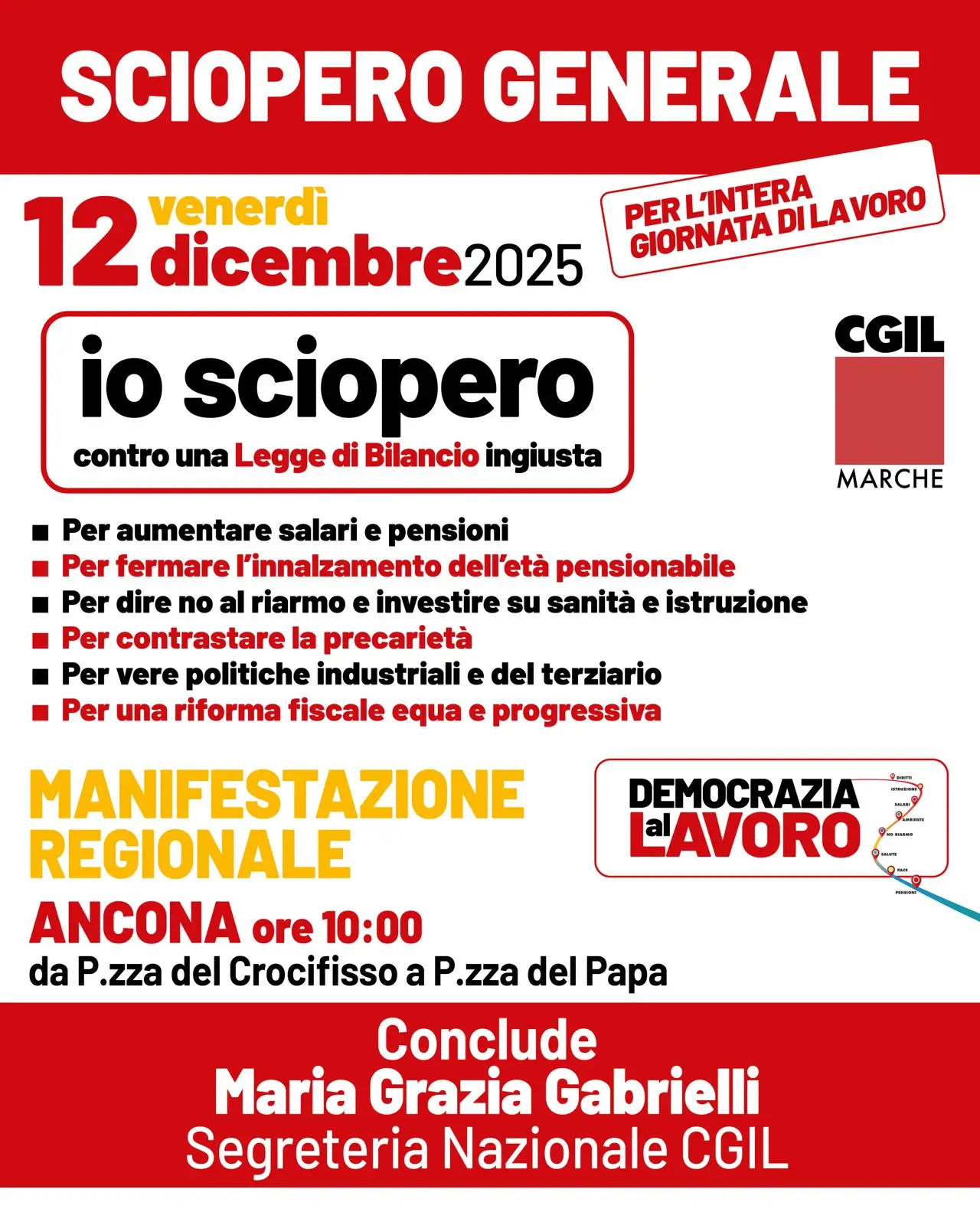 La segretaria confederale della Cgil Maria Grazia Gabrielli parteciperà alla manifestazione regionale ad Ancona in occasione dello sciopero generale per l'intera giornata di lavoro proclamato dalla Confederazione contro una Legge di Bilancio ingiusta. Appuntamento venerdì 12 dicembre in Piazza del Crocifisso, ore 10.00, corteo e comizio conclusivo in Piazza del Papa. Per informazioni clicca qui