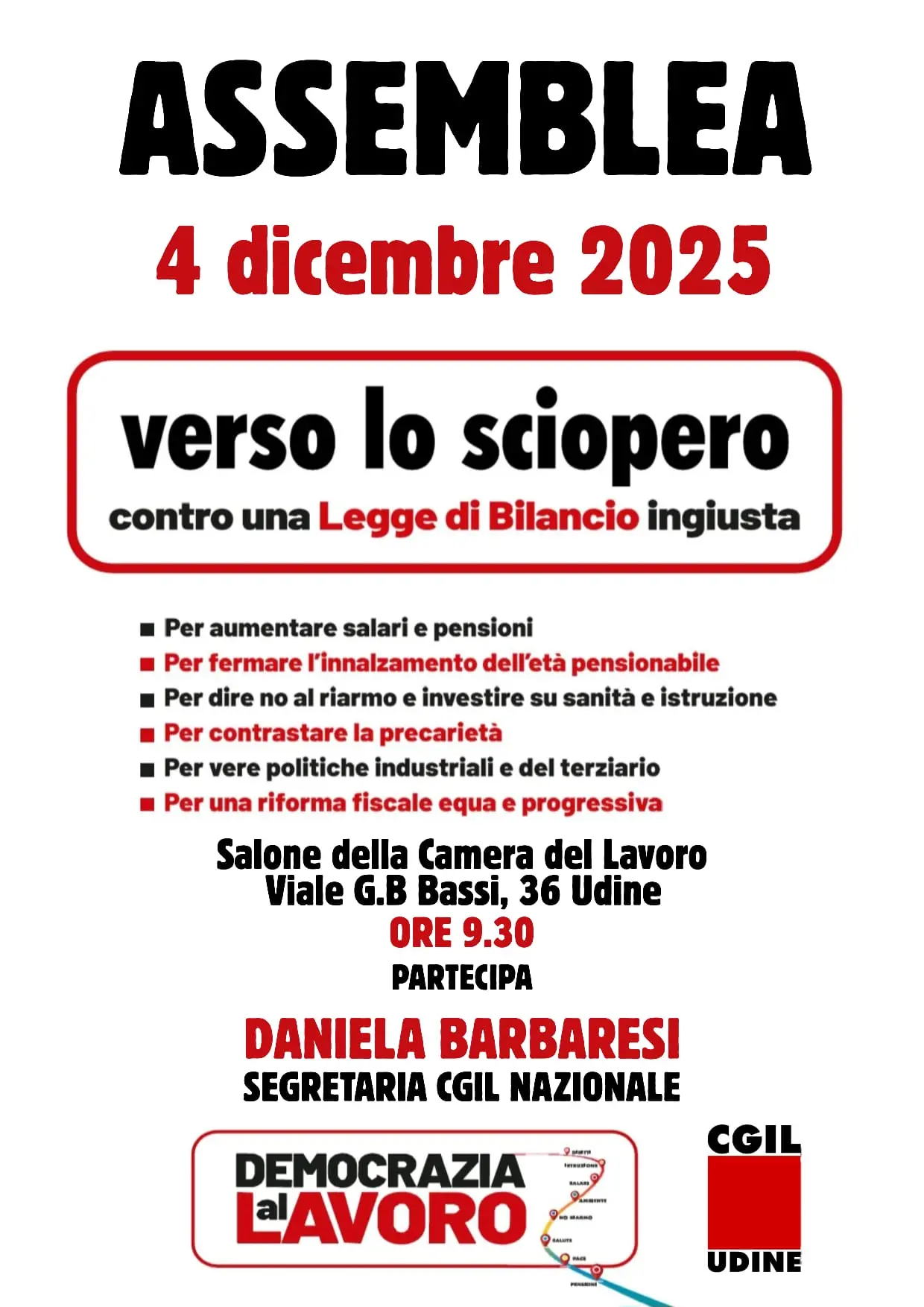 La segretaria confederale della Cgil Daniela Barbaresi parteciperà all’Assemblea Cgil Udine in vista dello sciopero generale del 12 dicembre. Appuntamento giovedì 4 dicembre a Udine presso il salone della Camera del Lavoro in Viale G.B. Bassi n.36, ore 9.30.