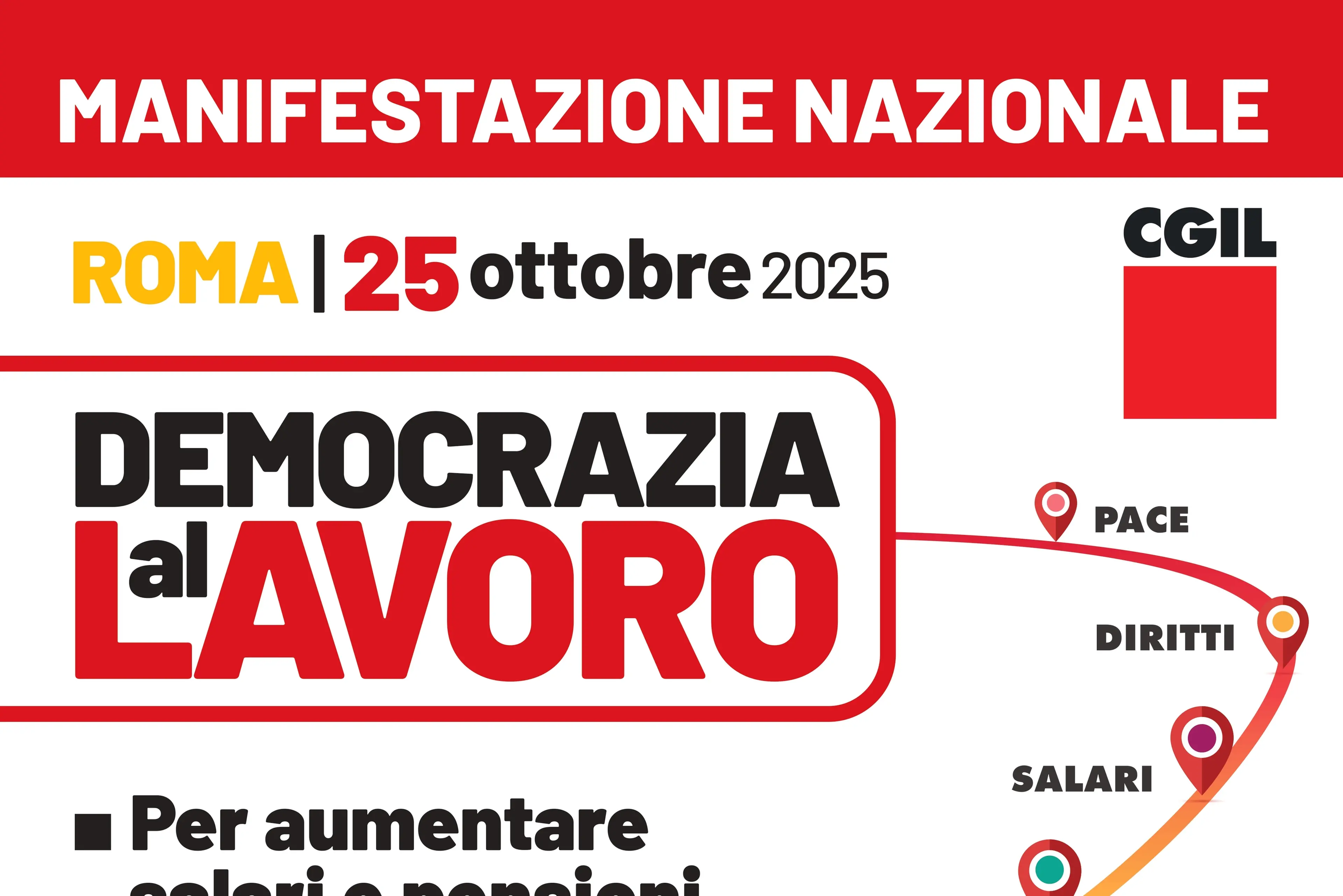 La Cgil organizza una manifestazione nazionale a Roma sabato 25 ottobre per l’aumento di salari e pensioni, per dire NO al riarmo, per investire su sanità e scuola, per dire NO alla precarietà e per una vera riforma fiscale. Concentramento a P.zza della Repubblica, ore 13.30, corteo fino a P.zza San Giovanni in Laterano. Conclude il segretario generale della Cgil Maurizio Landini, partecipa la segreteria confederale. Per informazioni clicca qui