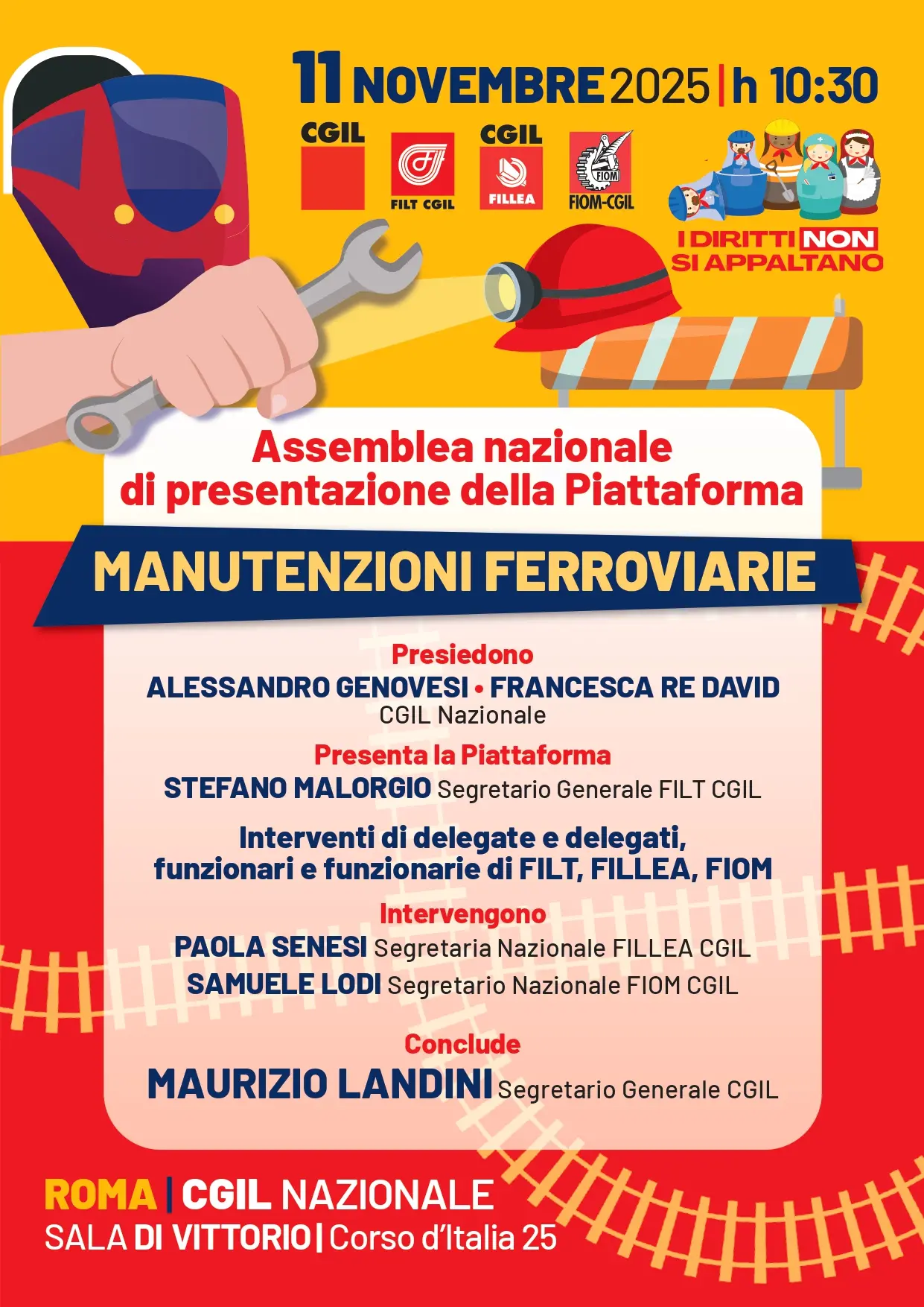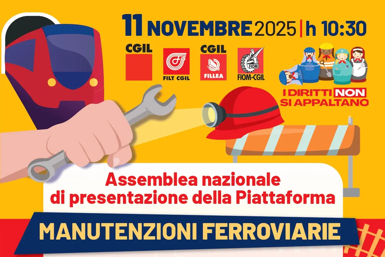 Cgil, Fillea, Filt e Fiom Cgil presentano la Piattaforma Manutenzioni Ferroviarie nel corso di un’assemblea che si terrà a Roma martedì 11 novembre presso la Cgil nazionale, sala G. Di Vittorio, in corso d’Italia n.25, ore 10.30. L’inizativa, che si colloca all’interno della più generale campagna “I diritti non si appaltano”, oltre a discutere e varare la piattaforma vera e propria, sarà anche l’occasione per sperimentare e promuovere un lavoro sindacale e organizzativo, in piena coerenza con le scelte assunte dall’organizzazione in materia di contrattazione inclusiva. Interverranno la segretaria confederale della Cgil Francesca Re David e il segretario generale Maurizio Landini