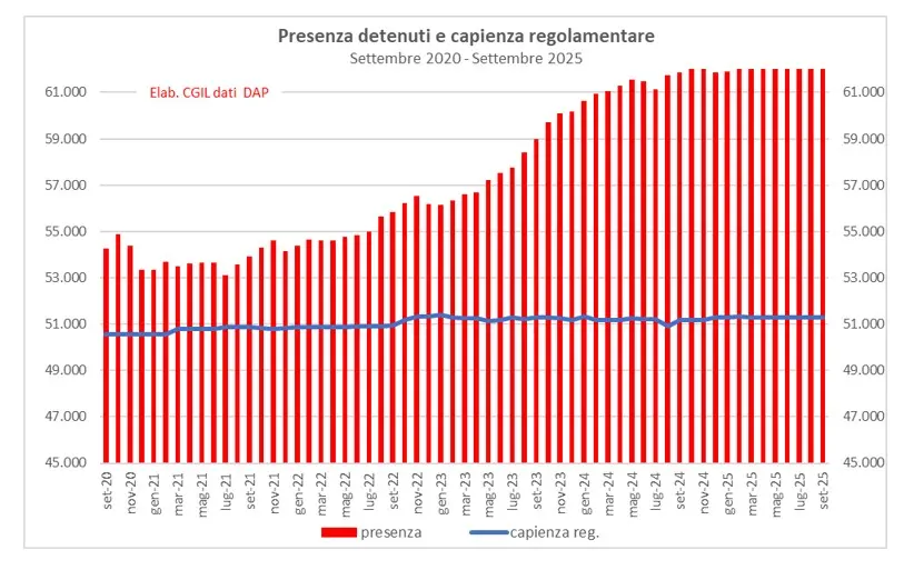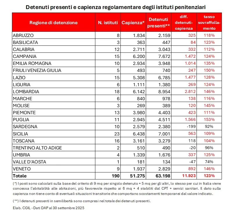 Numeri che portano a un tasso di sovraffollamento medio del 123%, che arriva al 153% nelle carceri della Puglia, al 150% in Friuli Venezia-Giulia, 146% in Veneto e in Lombardia, e che supera il 150% in ben 45 istituti. Tassi tra i più alti in Europa, ancora più drammatici in molte strutture, come a Brescia dove la popolazione detenuta è di più del doppio dei posti (204%), Bergamo (189%), Foggia (184%), Verona (181%), Roma Regina Coeli (180%).