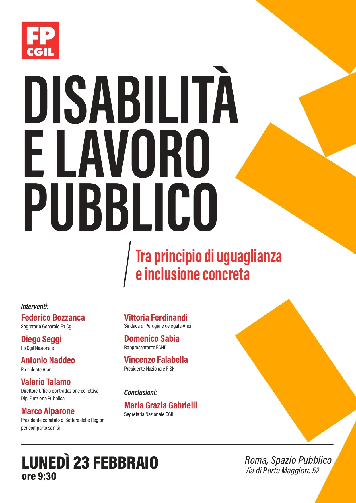 La segretaria confederale della Cgil Maria Grazia Gabrielli concluderà l’iniziativa promossa dalla Fp Cgil ‘Disabilità e lavoro pubblico. Tra principio di uguaglianza e inclusione concreta’. Appuntamento a Roma lunedì 23 febbraio presso Spazio Pubblico in via di Porta Maggiore n.52, ore 9.30.