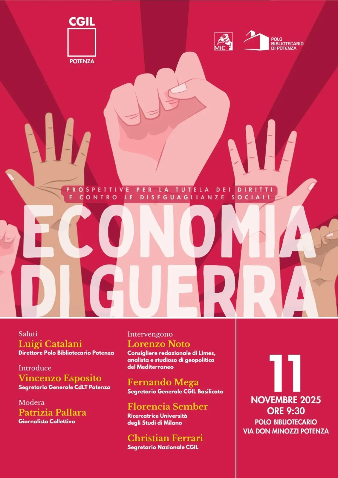Il segretario confederale della Cgil Christian Ferrari concluderà l’iniziativa promossa dalla Cgil Potenza ‘Economia di guerra. Prospettive per la tutela dei diritti e contro le disuguaglianze sociali’. Appuntamento martedì 11 novembre a Potenza presso il Polo Bibliotecario in Via Don Minozzi, ore 9.30.