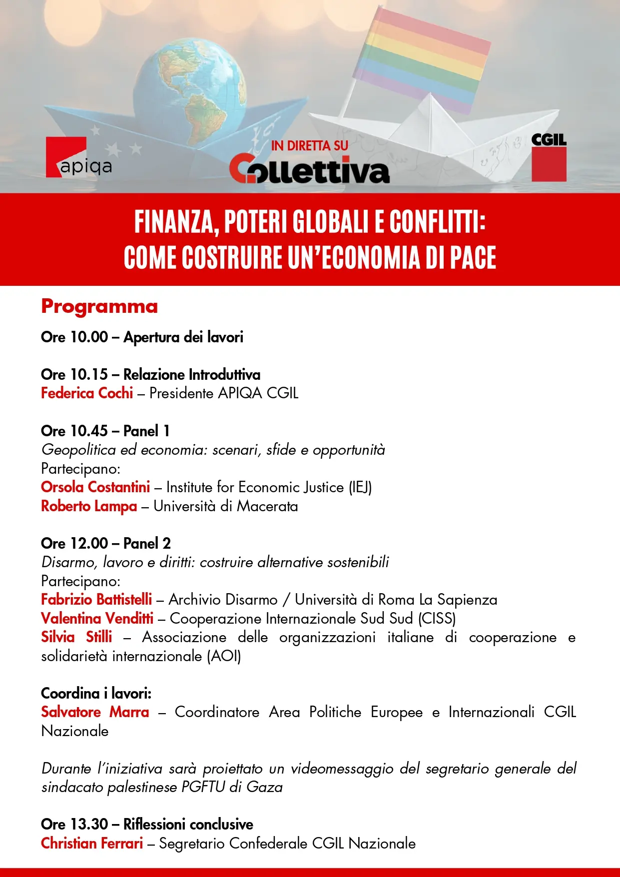 Il segretario confederale della Cgil Christian Ferrari concluderà l’iniziativa di approfondimento su 'Finanza, poteri globali e conflitti: come costruire un’economia di pace', promossa da APIQA insieme alle aree Politiche per lo Sviluppo e Politiche Europee e Internazionali della Cgil nazionale. Una iniziativa centrata sulle dinamiche economiche e finanziarie e le prospettive geopolitiche internazionali, con un focus sugli impatti e le implicazioni dell’economia del riarmo e sulla questione Palestinese. Appuntamento a Roma, martedì 7 ottobre, presso la Sala Santi della CGIL Nazionale in Corso d’Italia n.25, ore 10.00.