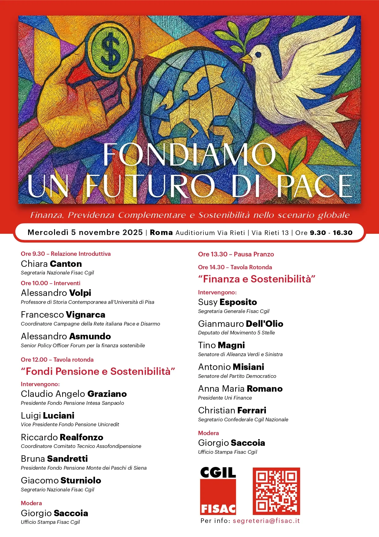 Il segretario confederale della Cgil Christian Ferrari interverrà alla tavola rotonda “Finanza e Sostenibilità”, nell’ambito dell’iniziativa promossa dalla Fisac Cgil ‘Fondiamo un futuro di pace. Finanza, Previdenza Complementare e Sostenibilità nello scenario globale’. Appuntamento mercoledì 5 novembre a Roma presso l’Auditorium di Via Rieti, via Rieti n.13, ore 14.30. Per informazioni clicca qui