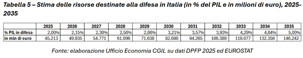 Infatti, partendo dal PIL nominale del 2025-2028 (DPFP 2025), e ipotizzando che dal 2029 al 2035 ci sia una crescita nominale annua del +2,6% (pari a quella del 2028 nonché alla media 2000-2024), e tenendo conto che alla spesa per la difesa sarà destinato il 2% del PIL già nel 2025, e che tale percentuale crescerà gradualmente fino al 2,50% entro il triennio e poi fino al 5,00% entro il decennio, abbiamo stimato che l’Italia destinerà dai 45,2 miliardi nel 2025 a oltre 146,2 miliardi nel 2035, con un aumento medio di oltre +10 miliardi all’anno.