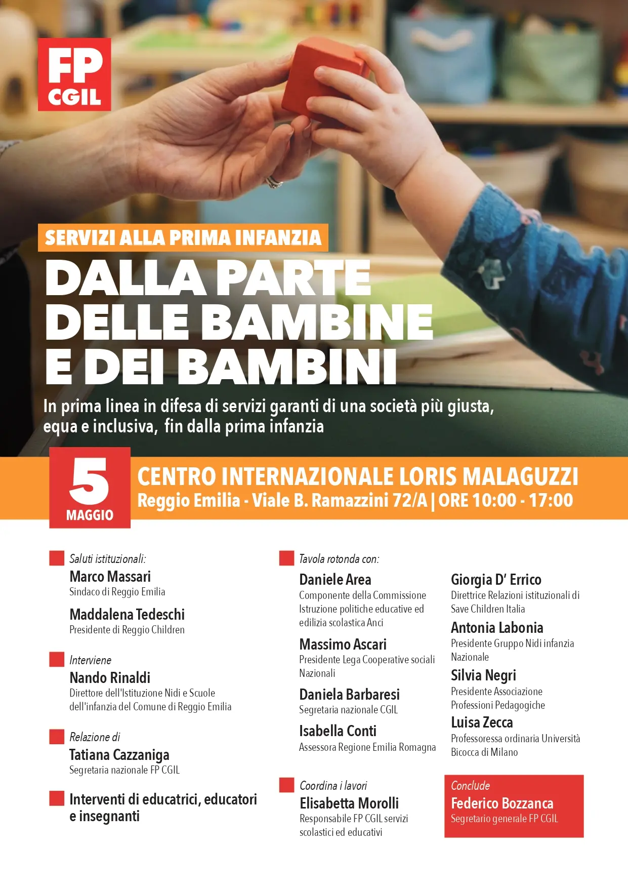 La segretaria confederale della Cgil Daniela Barbaresi interverrà alla tavola rotonda nell’ambito dell’iniziativa promossa dalla Fp Cgil ‘Servizi alla prima infanzia: dalla parte delle bambine e dei bambini’. Appuntamento a Reggio Emilia martedì 5 maggio presso il Centro Internazionale Loris Malaguzzi in Viale B. Ramazzini n.72/A, ore 10.00.