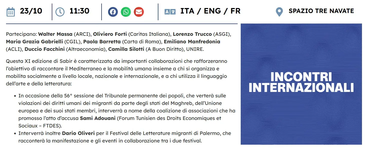 La segretaria confederale della Cgil Maria Grazia Gabrielli parteciperà all’evento di apertura dell’XI edizione del Festival Sabir – Festival della Società Civile del Mediterraneo che si terrà dal 23 al 25 ottobre a Palermo presso i Cantieri Culturali alla Zisa in Via Paolo Gili, n.4. L’inaugurazione si terrà giovedì 23 ottobre presso lo Spazio Tre Navate, ore 11.30. Per informazioni clicca qui