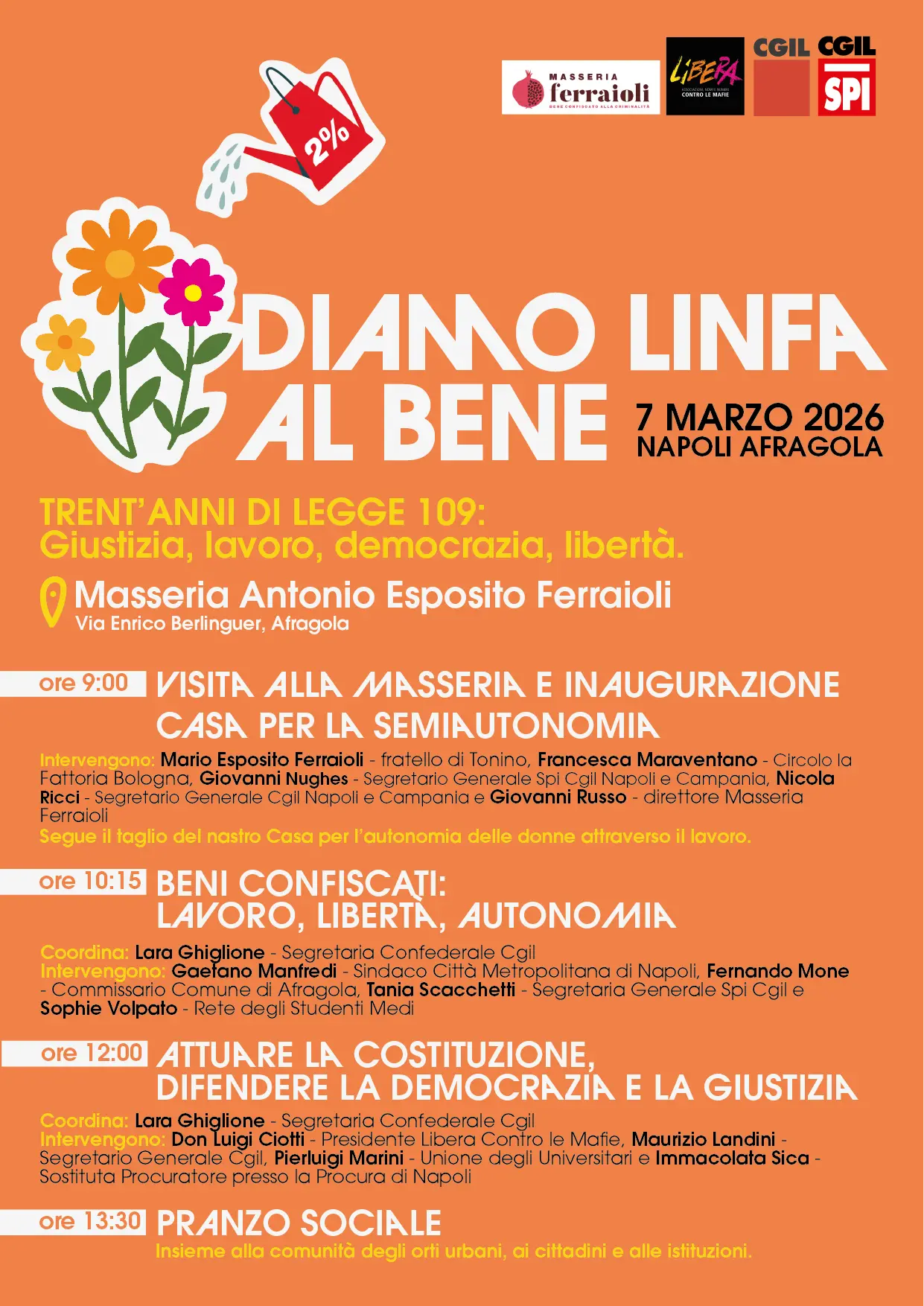 Il segretario generale della Cgil Maurizio Landini e la segretaria confederale Lara Ghiglione, interverranno all’iniziativa promossa da Cgil, Spi Cgil e Libera ‘Diamo linfa al bene. Trent’anni di legge 109: giustizia, lavoro, democrazia, libertà’ nell’ambito della campagna di mobilitazione avviata da Libera “Diamo Linfa al Bene”, sulla possibilità di devolvere una piccola parte (il 2%) del FUG - Fondo Unico Giustizia, alla valorizzazione dei beni confiscati in occasione dei 30 anni della legge 109\96. Appuntamento sabato 7 marzo presso la Masseria Antonio Esposito Ferraioli in via Enrico Berlinguer ad Afragola.