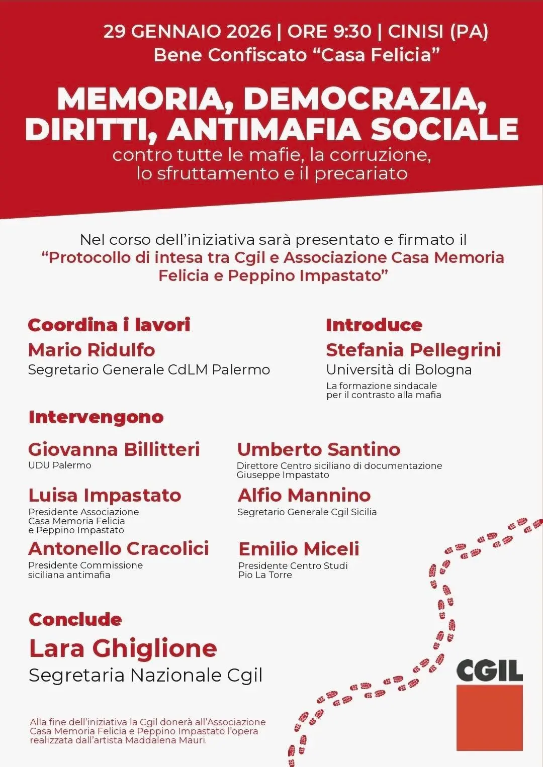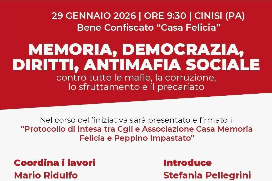 La segretaria confederale della Cgil Lara Ghiglione concluderà l’iniziativa ‘Memoria, democrazia, diritti, antimafia sociale, contro tutte le mafie, la corruzione, lo sfruttamento e il precariato’. Appuntamento a Cinisi giovedì 29 gennaio presso il Bene confiscato ‘Casa Felicia’, ore 9.30.