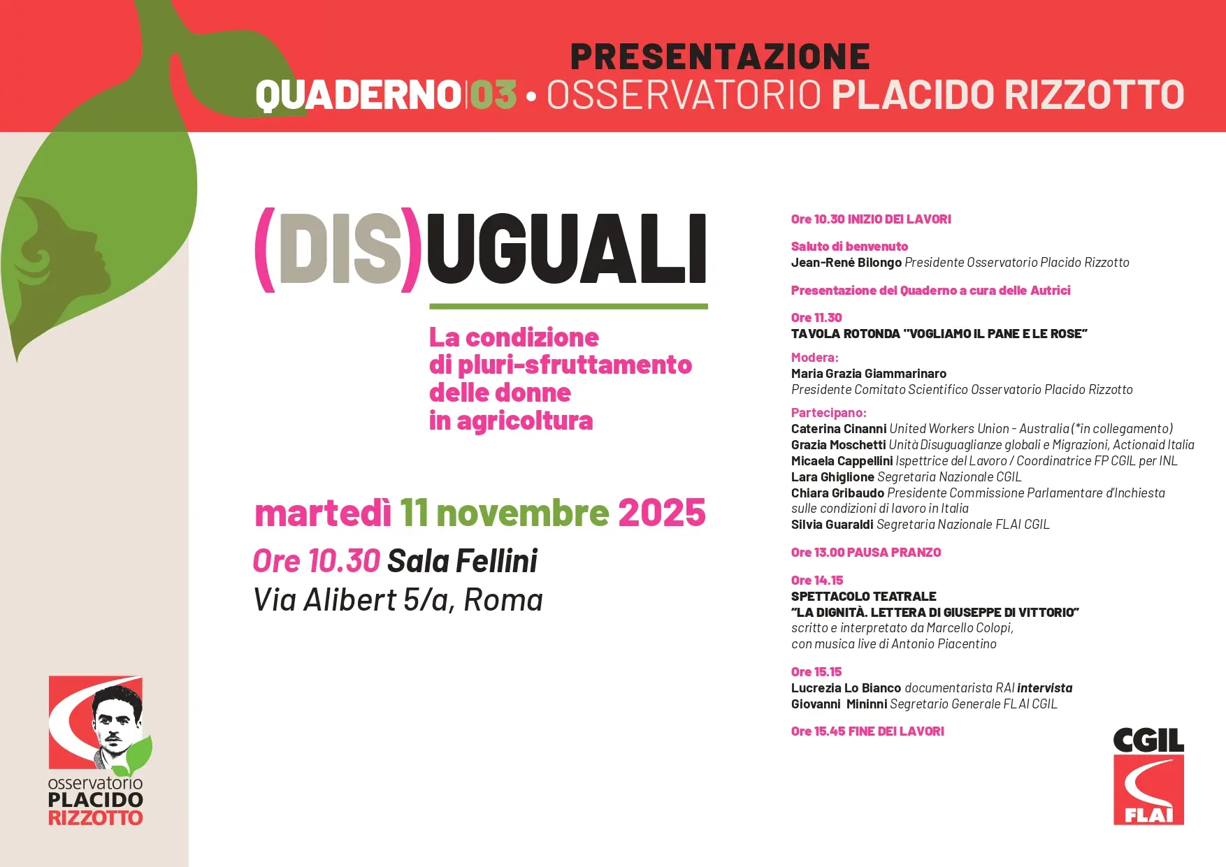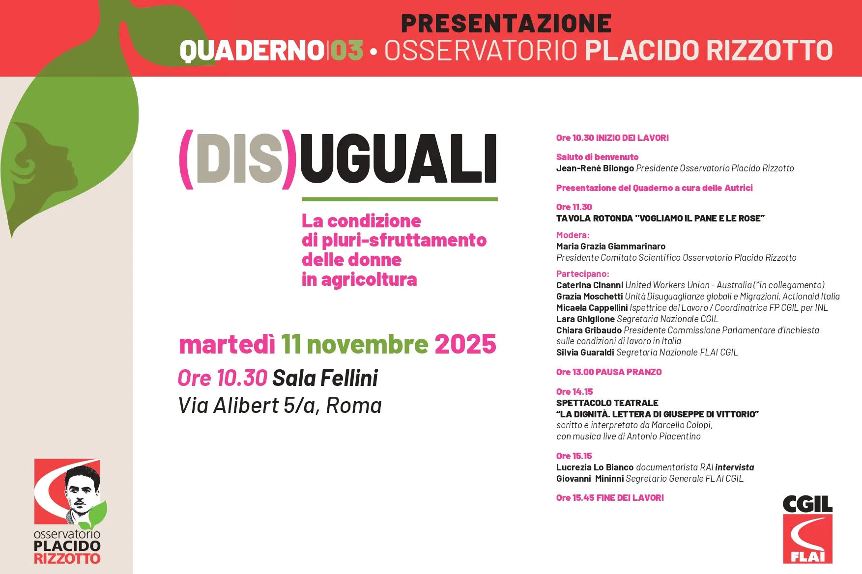 La segretaria confederale della Cgil Lara Ghiglione interverrà alla tavola rotonda ‘Vogliamo il pane e le rose’, nell’ambito della ‘Presentazione quaderno 03 (DIS)UGUALI. La condizione di pluri-sfruttamento delle donne in agricoltura’ promossa dall’Osservatorio Placido Rizzotto della Flai Cgil. Appuntamento martedì 11 novembre a Roma presso la Sala Fellini in Via Alibert n.5/a, ore 10.30