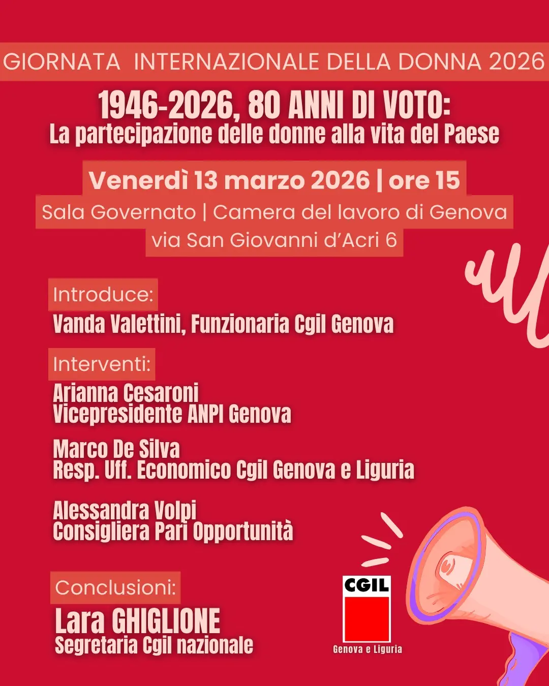 La segretaria confederale della Cgil Lara Ghiglione concluderà l’inizaitiva promossa dalla Cgil Genova e Liguria in occasione della Giornata Internazionale della donna 2026 dal titolo ‘1946-2026, 80 anni di voto: la partecipazione delle donne alla vita del Paese’. Appuntamento a Genova venerdì 13 marzo presso la sala Governato della Cgil Genova, via San Giovanni d’Acri n.6, ore 15.00.