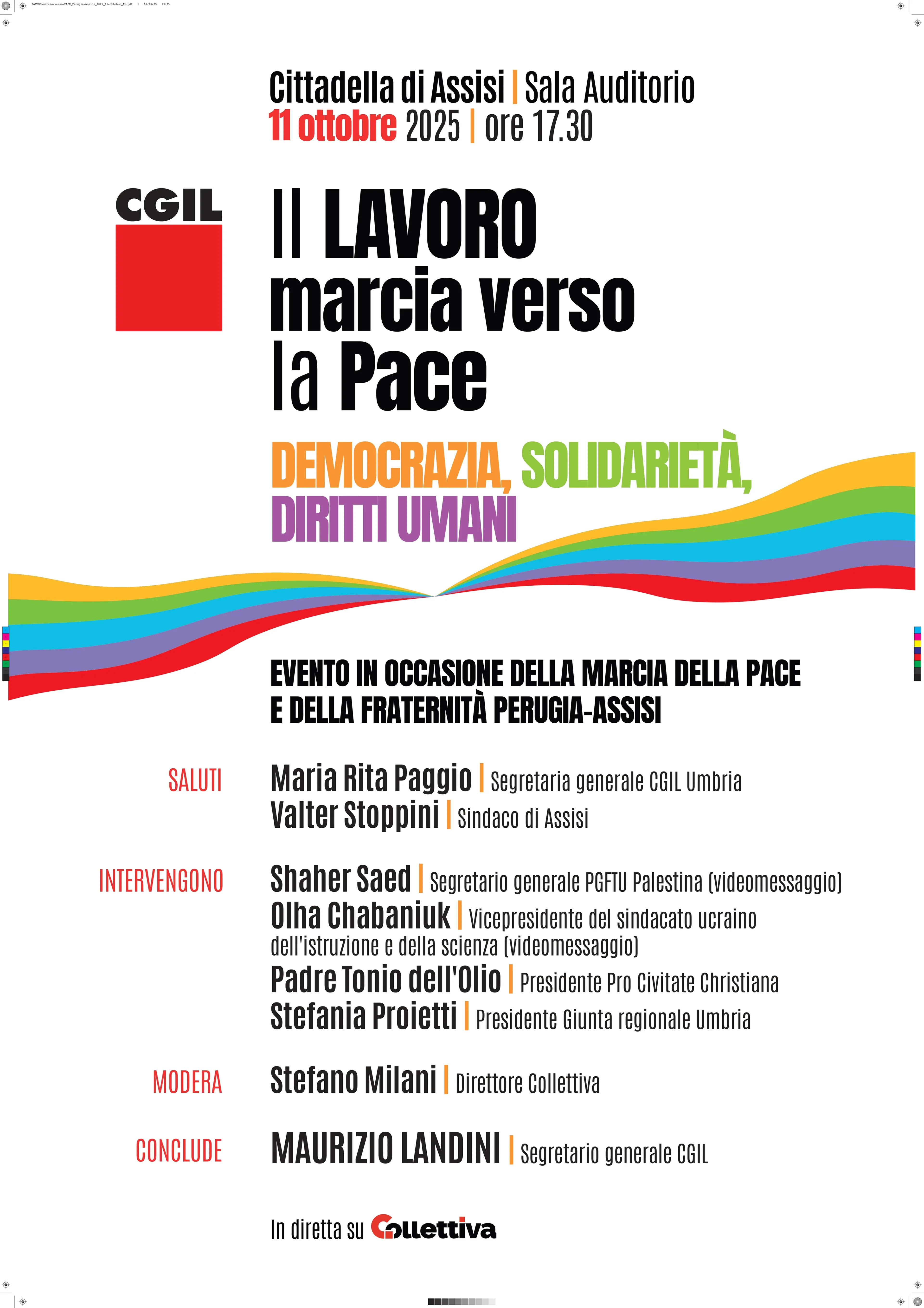Porteranno i loro saluti Maria Rita Paggio, Segretaria generale CGIL Umbria e Valter Stoppini, Sindaco di Assisi. Intervengono: Shaher Saed, Segretario generale PGFTU Palestina (videomessaggio); Olha Chabaniuk, Vicepresidente del sindacato ucraino dell'istruzione e della scienza (videomessaggio); Padre Tonio dell'Olio, Presidente Pro Civitate Christiana; Stefania Proietti, Presidente Giunta regionale Umbria. Modera Stefano Milani, Direttore Collettiva. Conclude Maurizio Landini, segretario generale della Cgil. Sarà possibile seguire l’evento in diretta streaming su Collettiva.it