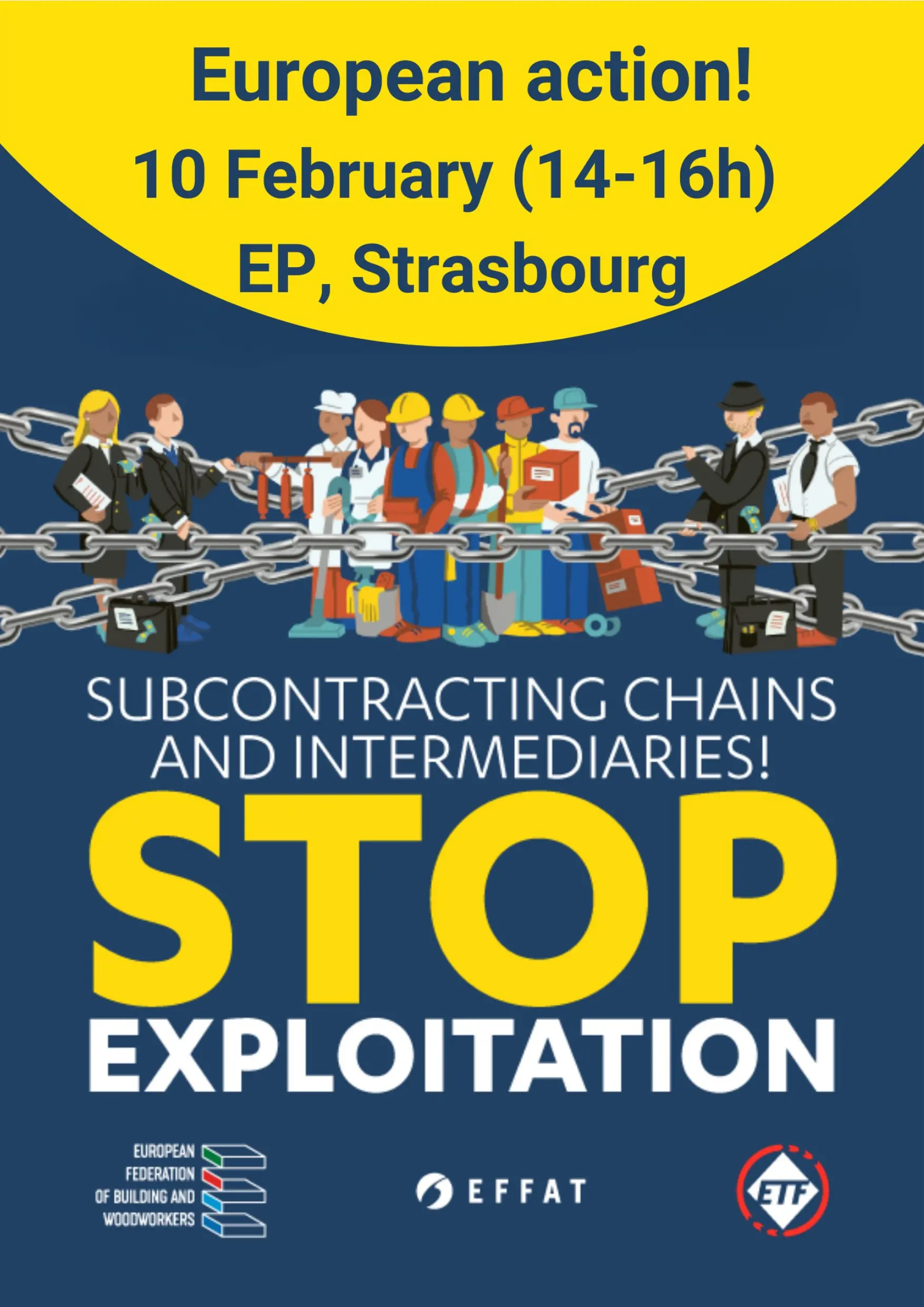 La manifestazione è organizzata da EFFAT (Federazione europea del settore agroalimentare), EFBWW (Federazione europea dei lavoratori delle costruzioni e del legno) ed ETF (Federazione europea dei trasporti).