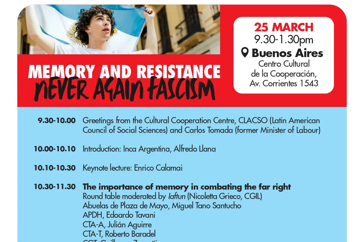 The initiative is organized by the International Anti-Fascist Trade Unions Network alongside the Italian General Confederation of Labour (CGIL), INCA (the assistance institute supporting pensioners and welfare rights for Italians abroad), the Federation of Italian Pensioners (SPI CGIL), and the Italian Federation of Knowledge Workers (FLC CGIL). The event will take place on the 25th March 2026. It will run from 9:30 a.m. to 1:30 p.m. at the Centro Cultural de la Cooperación, located on Avenida Corrientes.