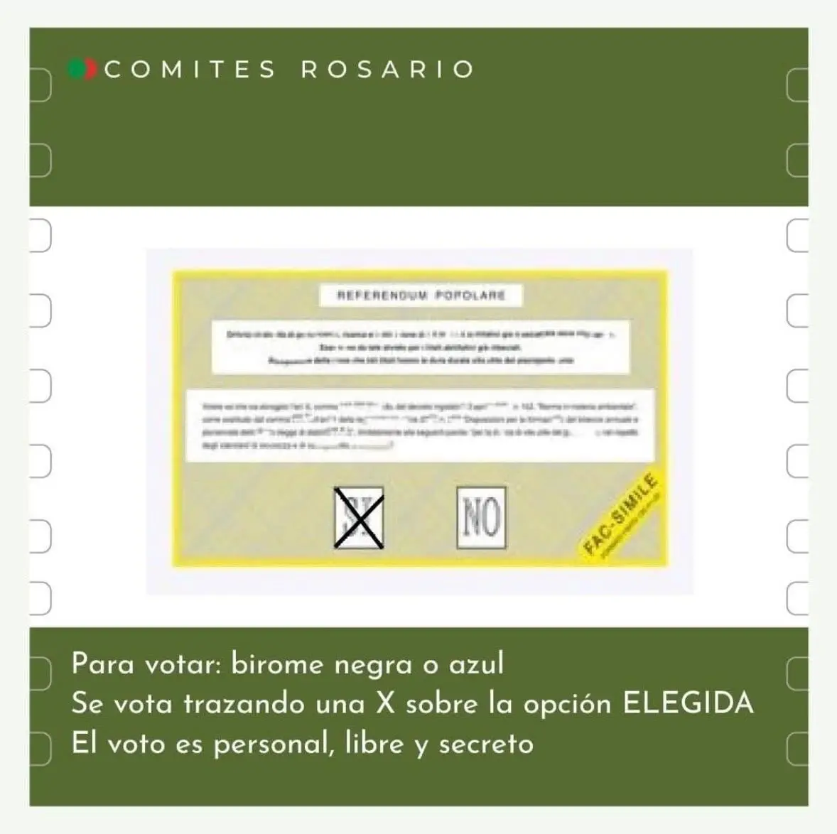 Allo stesso tempo, però, il Comitato per il NO segnala alcune presunte irregolarità nella comunicazione istituzionale. In particolare, viene richiamato il caso del materiale informativo diffuso dal COMITES di Rosario, in Argentina, “problema emerso anche durante l’assemblea del comitato per il NO del 4 marzo”, nel quale sarebbe stato inserito un fac-simile di scheda elettorale con l’indicazione dell’opzione “SÌ”, presentata come esempio.