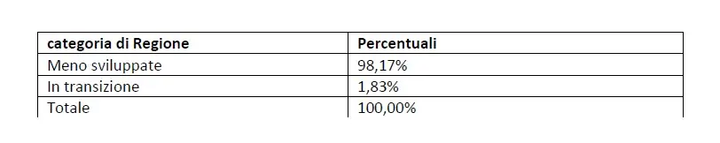 Rientrano tra le regioni in transizione le Marche, l’Umbria e l’Abruzzo, mentre rientrano nelle regioni meno sviluppate la Basilicata, la Calabria, la Campania, il Molise, la Puglia, la Sardegna e la Sicilia.