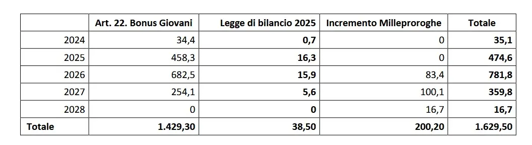 Il totale complessivo delle risorse per i tre bonus previsti dal decreto-legge 60/24, così come incrementato dalla proposta normativa approvata nel milleproroghe, diventerebbe il seguente: