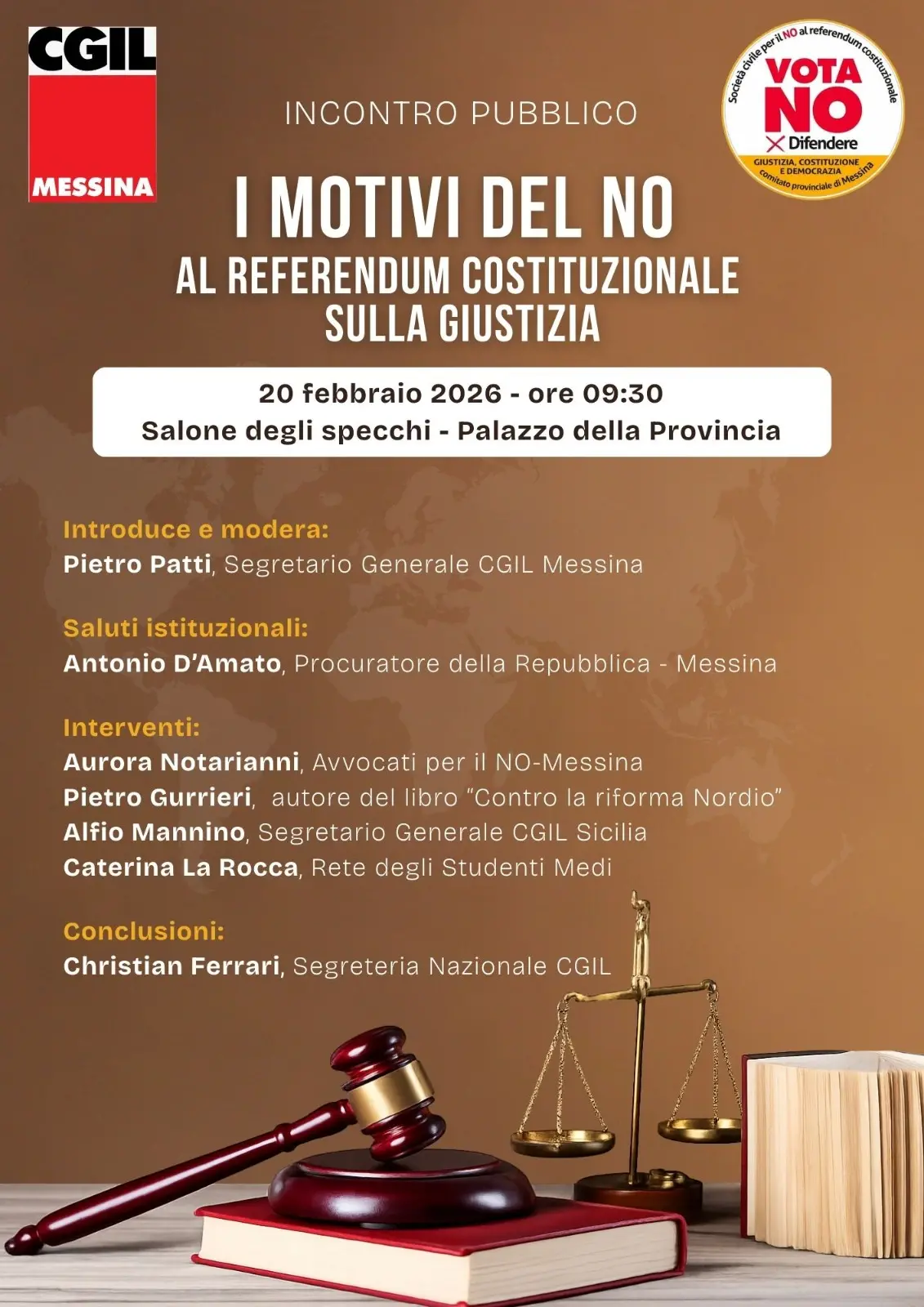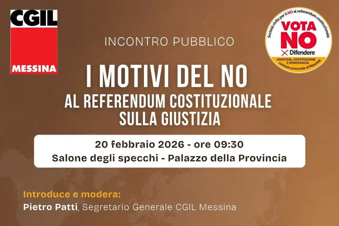 Il segretario confederale della Cgil Christian Ferrari concluderà l’incontro pubblico ‘I motivi del NO al referendum costituzionale sulla giustizia’ che si terrà a Messina venerdì 20 febbraio presso il Salone degli Specchi del Palazzo della Provincia, ore 9.30.