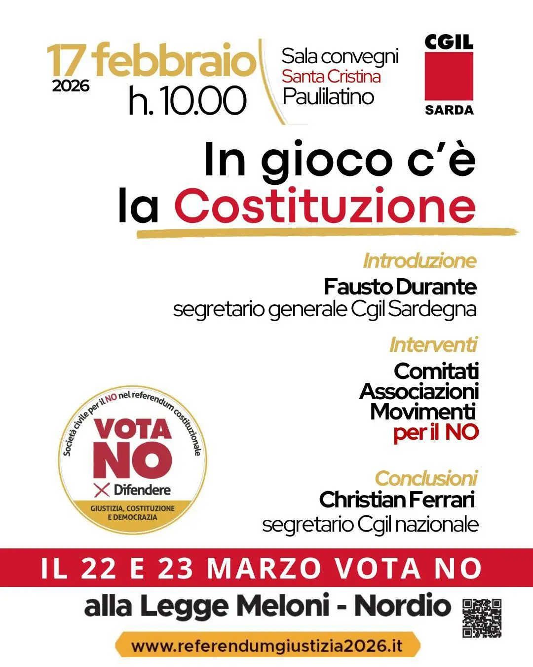 In gioco c’è la Costituzione PHOTOIl segretario confederale della Cgil Christian Ferrari concluderà l’iniziativa ‘In gioco c’è la Costituzione’ che si terrà martedì 17 febbraio a Paulilatino presso la Sala Convegni Santa Cristina, ore 10.00.