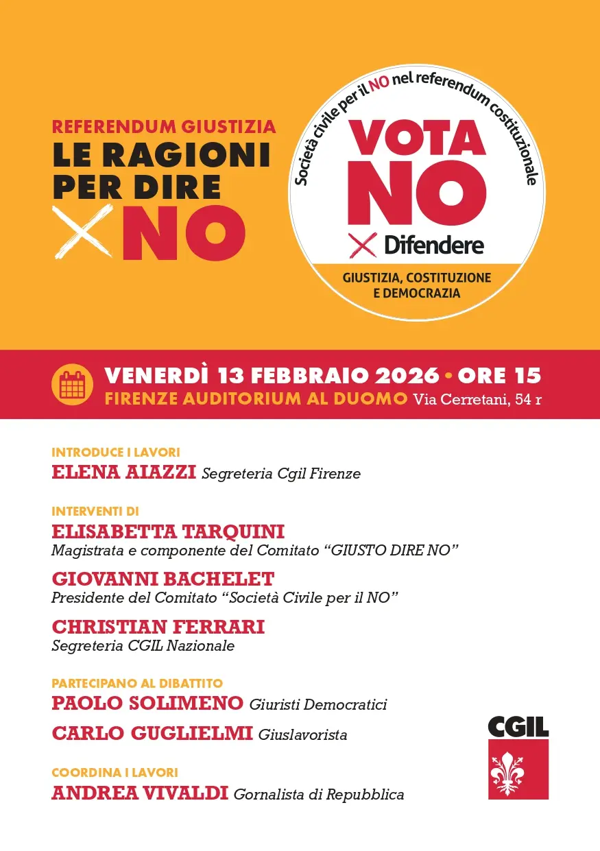 Il segretario confederale della Cgil Christian Ferrari interverrà all’iniziativa ‘Referendum giustizia: le ragioni per dire NO’ in programma a Firenze, venerdì 13 febbraio presso l’Auditorium al Duomo in Piazza Cerretani, n.54r, ore 15.00