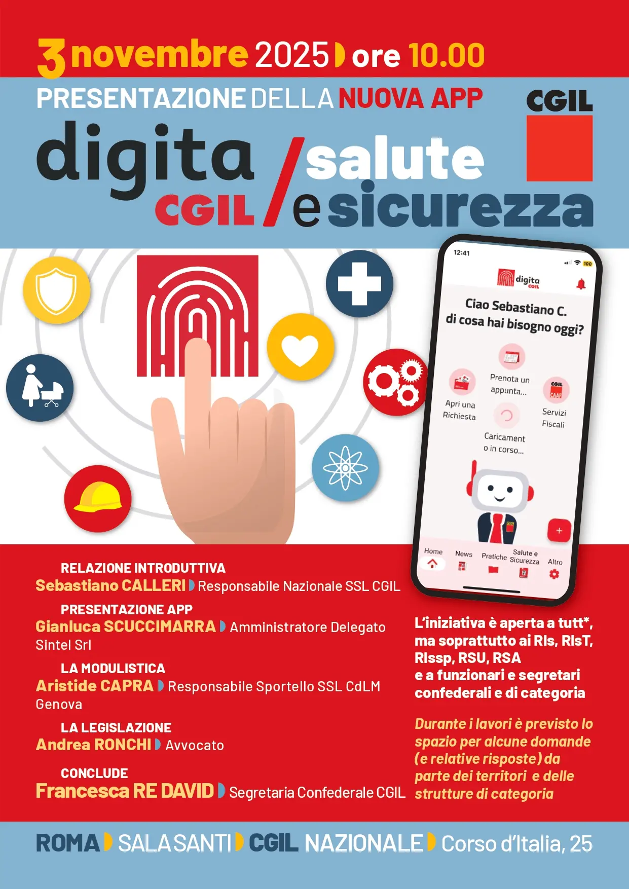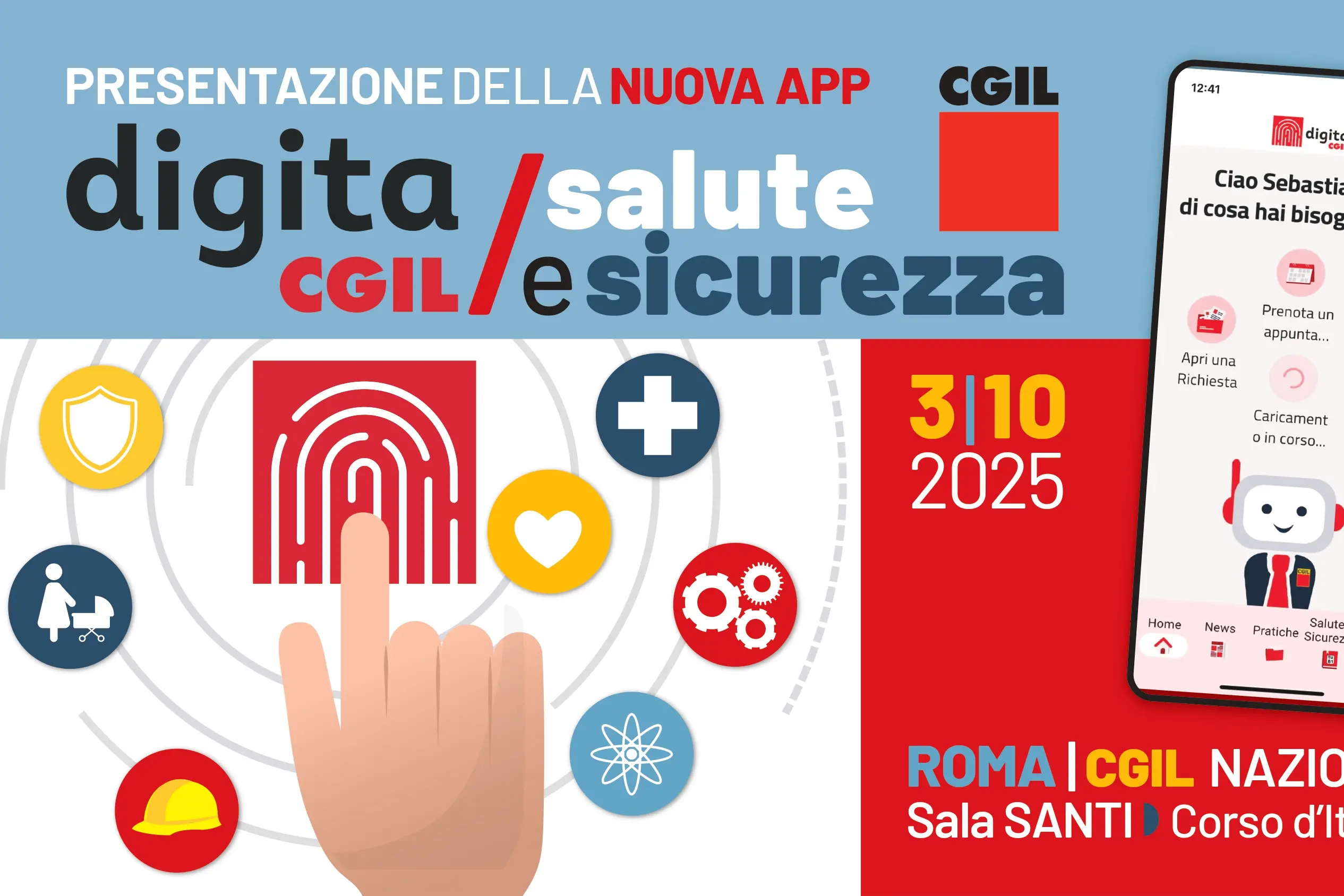 La Cgil presenta la nuova App Digita Cgil/Salute e sicurezza con una iniziativa che si terrà il prossimo lunedì 3 novembre a Roma presso la Sala Santi della Cgil nazionale, in Corso d’Italia n.25 a partire dalle ore 10.00.