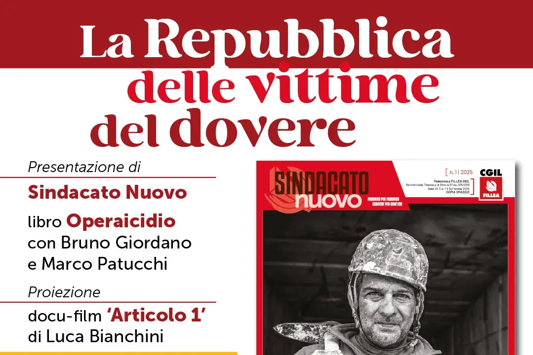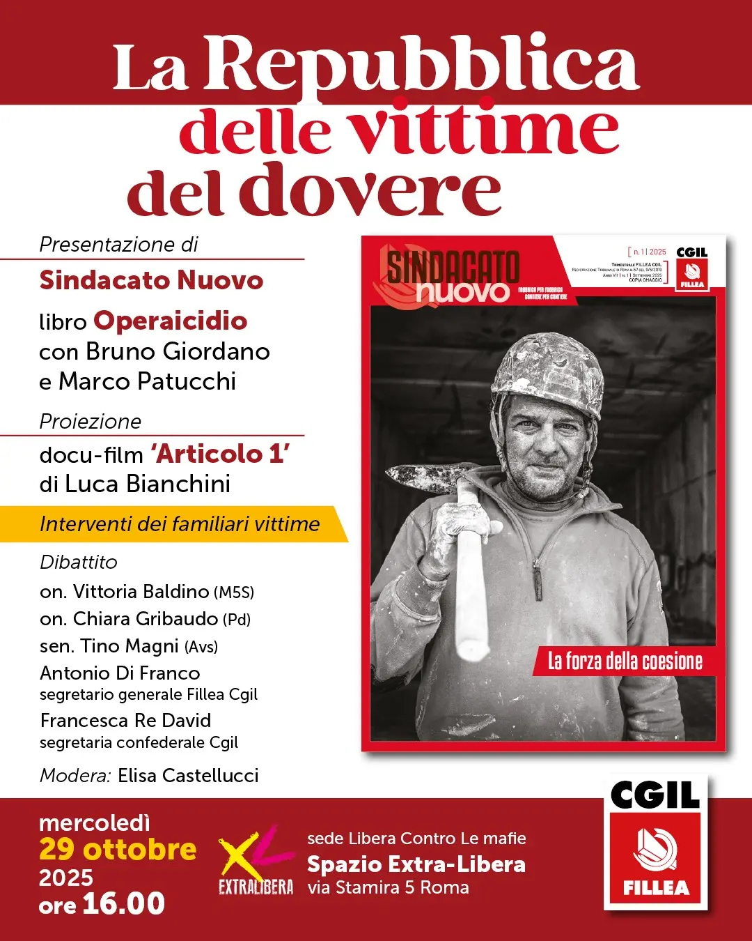 La segretaria confederale della Cgil Francesca Re David concluderà il dibattito promosso dalla Fillea Cgil in occasione della proiezione del docu-film 'Articolo 1' di Luca Bianchini prodotto da Alveare Cinema in collaborazione con Rai Documentari e la presentazione del giornale Sindacato Nuovo e del libro Operaicidio, con Bruno Giordano e il giornalista Marco Patucchi. Previste le testimonianze dei familiari delle vittime, e gli interventi del segretario generale della Fillea Cgil Antonio Di Franco, l'on. Chiara Gribaudo (Pd), on. Vittoria Baldino (M5S), sen. Tino Magni (Avs).
