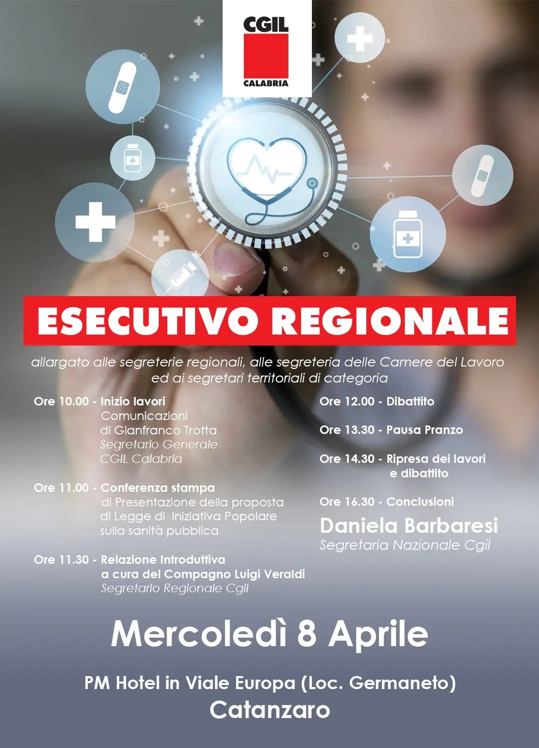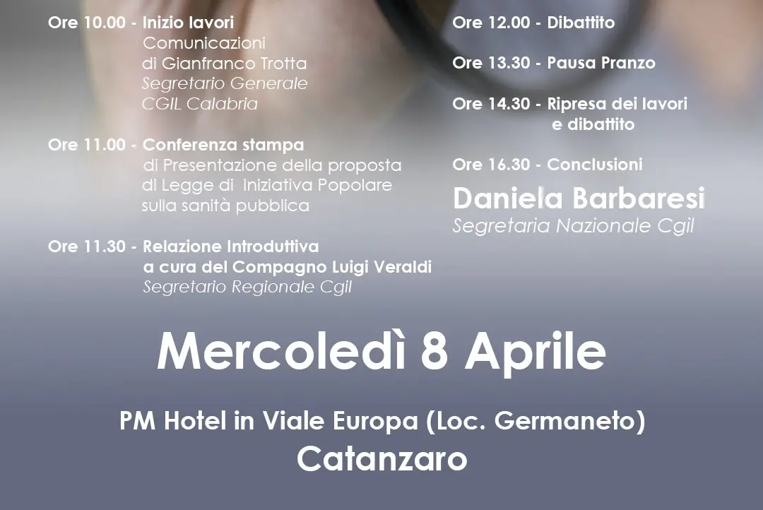 La segretaria confederale della Cgil Daniela Barbaresi concluderà l’esecutivo regionale della Cgil Calabria nel corso del quale verrà presentata la proposta di Legge di iniziativa popolare sulla sanità pubblica. Appuntamento a Catanzaro mercoledì 8 aprile presso PM Hotel in viale Europa (Loc. Germaneto), ore 10.00.