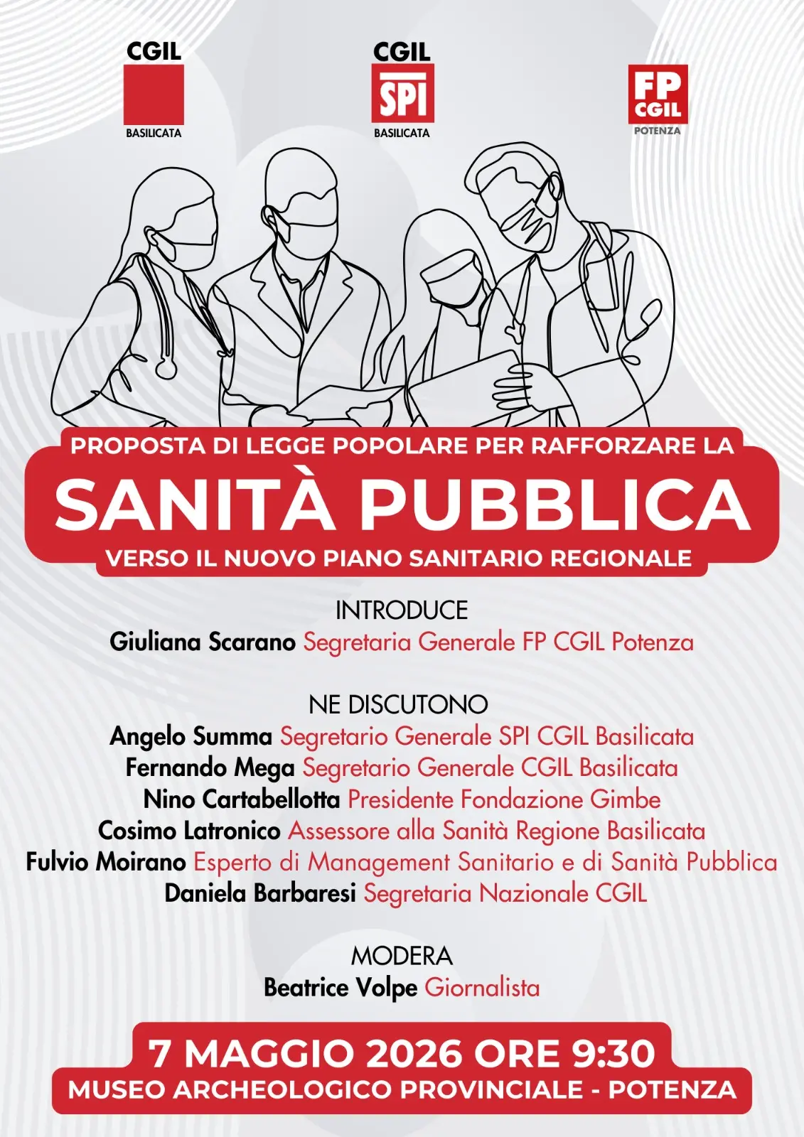 La segretaria confederale della Cgil Daniela Barbaresi interverrà al dibattito ‘Proposta di legge popolare per rafforzare la sanità pubblica. Verso il nuovo piano sanitario regionale’ promosso da Cgil, Spi e Fp Cgil Basilicata. Appuntamento giovedì 7 maggio a Potenza presso il museo archeologico provinciale, ore 9.30