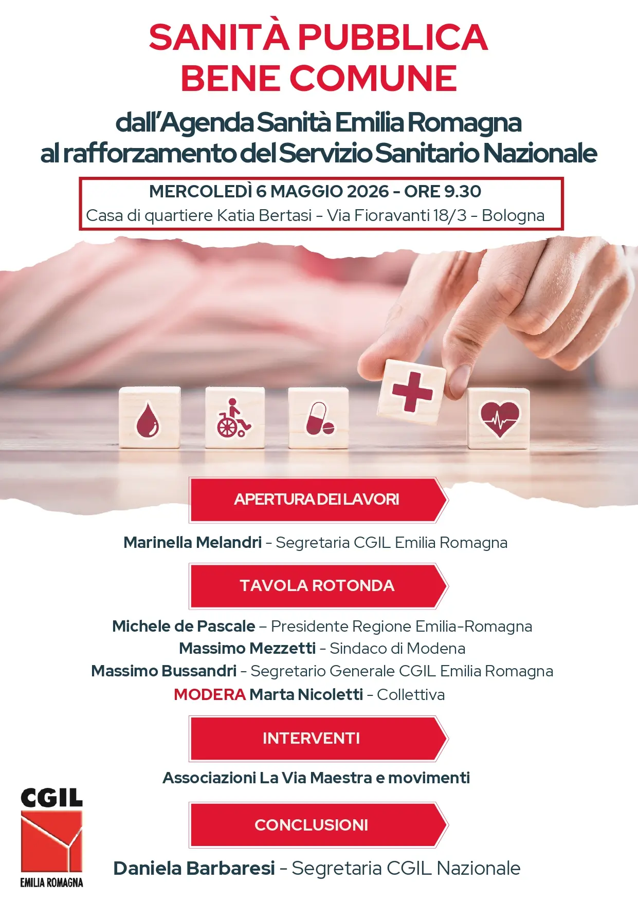 La segretaria confederale della Cgil Daniela Barbaresi concluderà l’iniziativa promossa dalla Cgil Emilia Romagna ‘Sanità pubblica bene comune. Dall’Agenda Sanità Emilia Romagna al rafforzamento del Servizio Sanitario Nazionale’. Appuntamento a Bologna mercoledì 6 maggio presso la Casa di quartiere Katia Bertasi in Via Fioravanti n.18/3, ore 9.30.