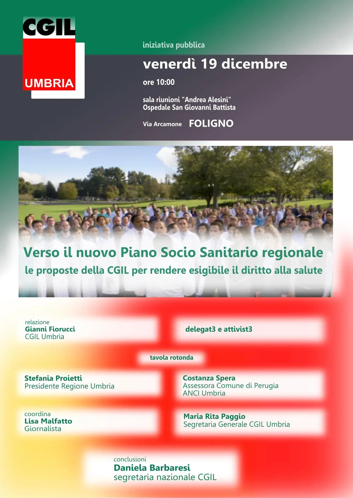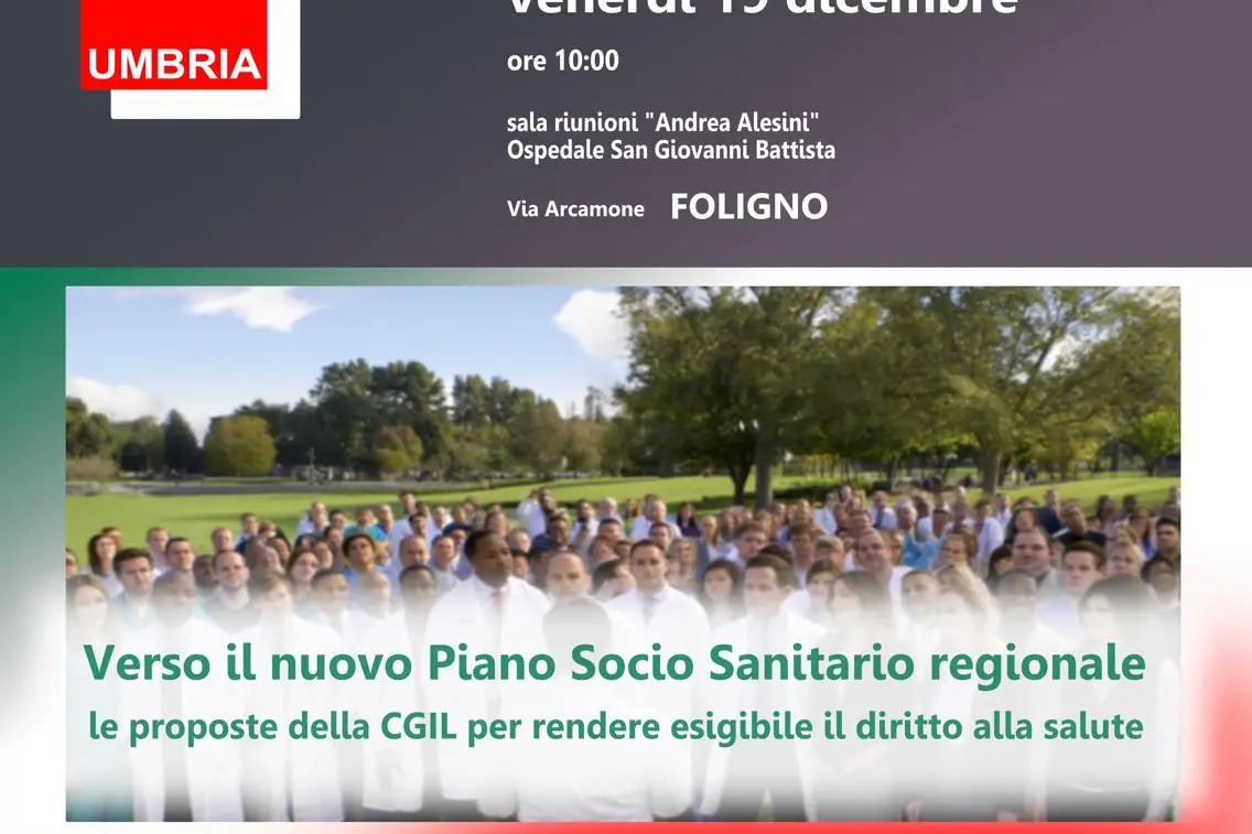 La segretaria confederale della Cgil Daniela Barbaresi concluderà l’iniziativa promossa dalla Cgil Umbria ‘Verso il Nuovo Piano Socio Sanitario regionale. Le proposte della Cgil per rendere esigibile il diritto alla salute’. Appuntamento a Foligno venerdì 19 dicembre presso la sala riunioni ‘Andrea Alesini’ dell’ospedale San Giovanni Battista in via Arcamone, ore 10.00.