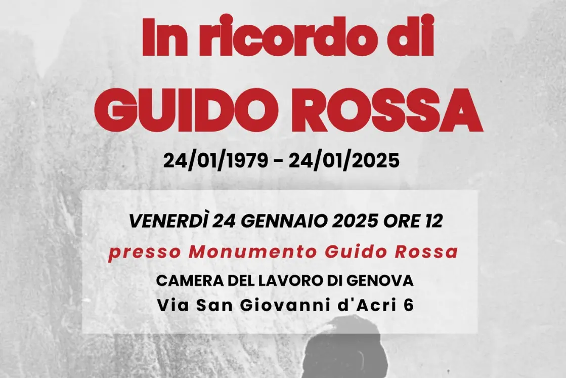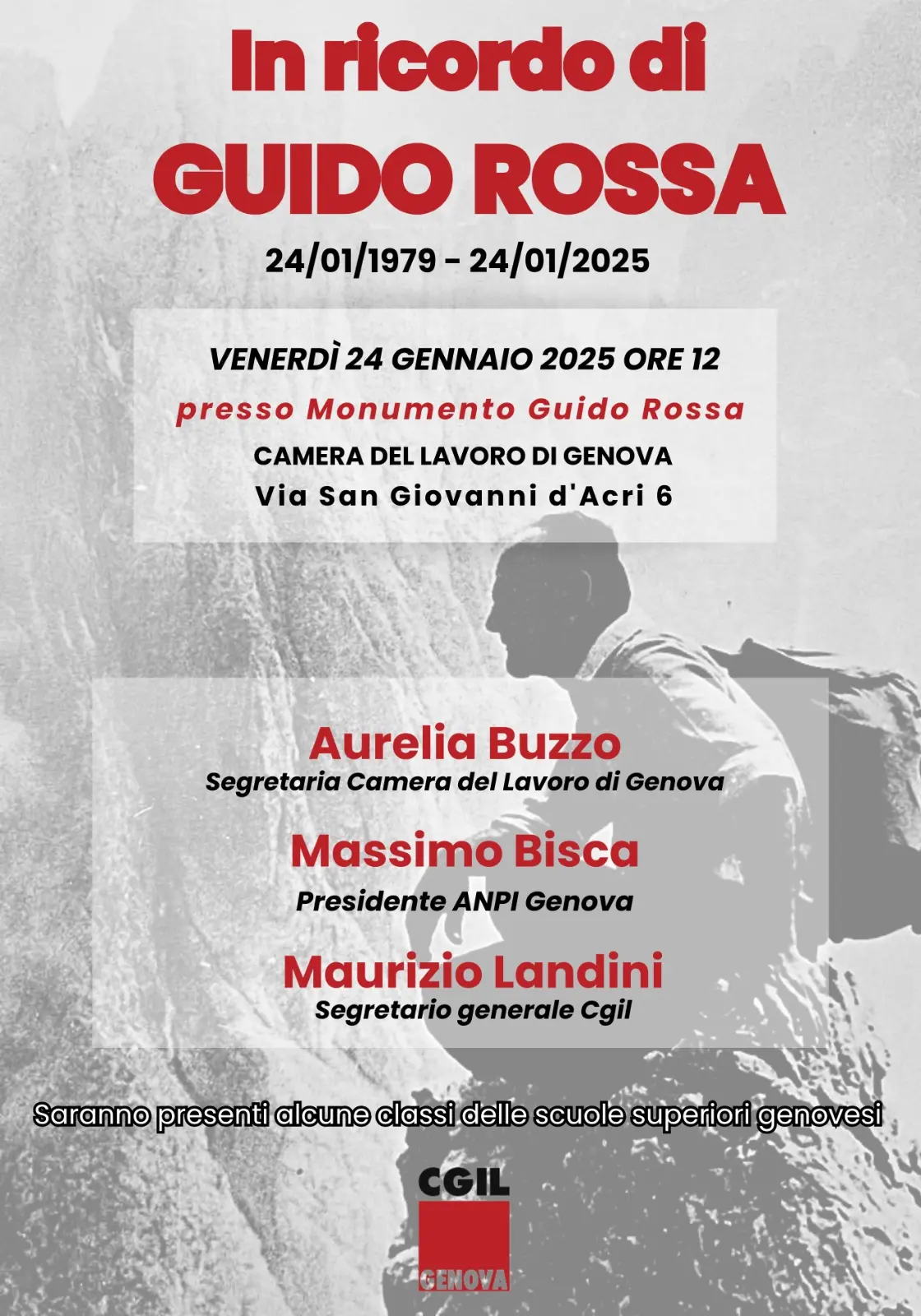Il segretario generale della Cgil Maurizio Landini interverrà all’iniziativa in ricordo di Guido Rossa presso la Camera del Lavoro di Genova. Interverranno inoltre Aurelia Buzzo Segretaria Cgil Genova e Massimo Bisca Presidente ANPI Genova. Parteciperanno alcune classi delle scuole superiori genovesi. Appuntamento a Genova in via San Giovanni d'Acri n.6, ore 12.00