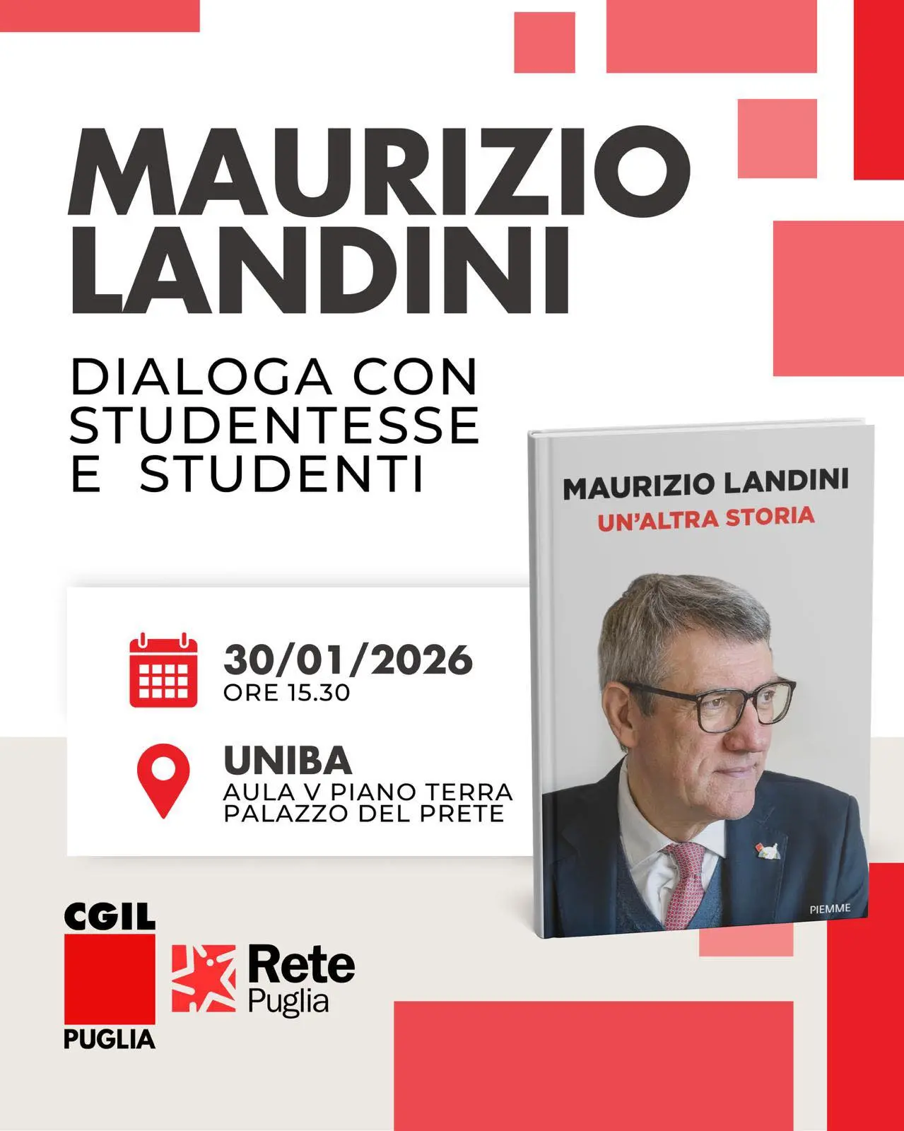 Il segretario generale della Cgil Maurizio Landini nel corso di un incontro promosso dalla Cgil Puglia e Rete Puglia, dialogherà con studentesse e studenti di precariato, di diritti e tutele, di lotte e conquiste del mondo del lavoro, di emigrazioni e mezzogiorno. A partire dalla sua biografia “Un’altra storia”. Appuntamento venerdì 30 gennaio a Bari presso Uniba, aula V, piano terra, Palazzo Del Prete, ore 15.30.