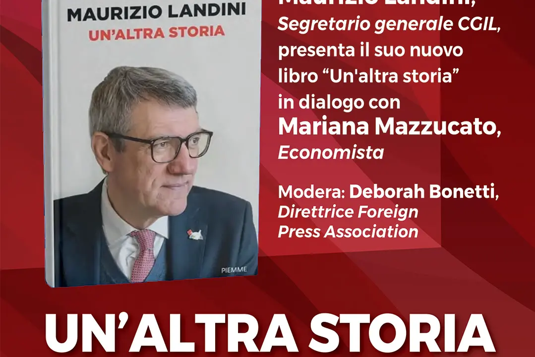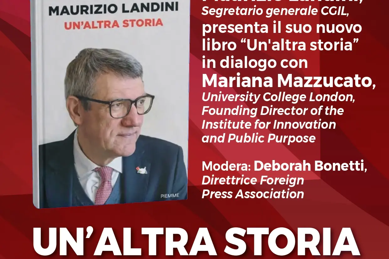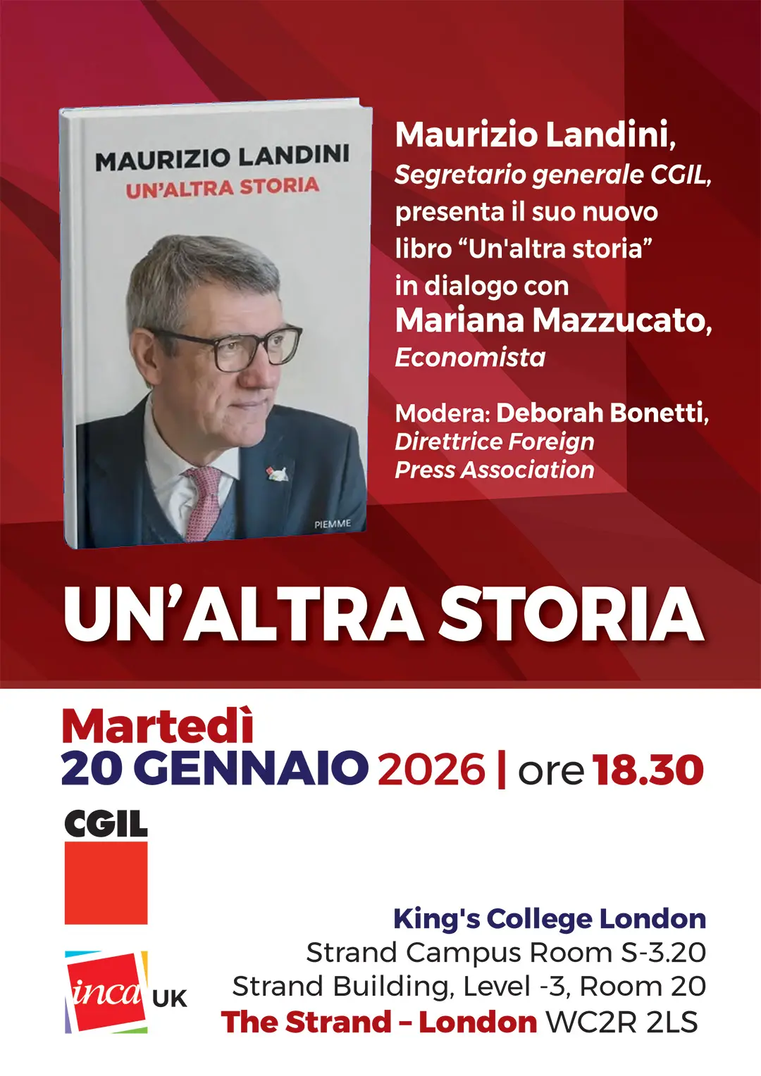 Il segretario generale della Cgil Maurizio Landini presenta il suo libro ‘Un’altra storia’ in dialogo con l’economista Marianna Mazzuccato. Modera Deborah Bonetti, direttrice Foreign Press Association. Appuntamento martedì 20 gennaio a Londra presso il King’s College London, Strand Campus Room S-3.20, Strand Building, level -3, Room 20, ore 18.30.