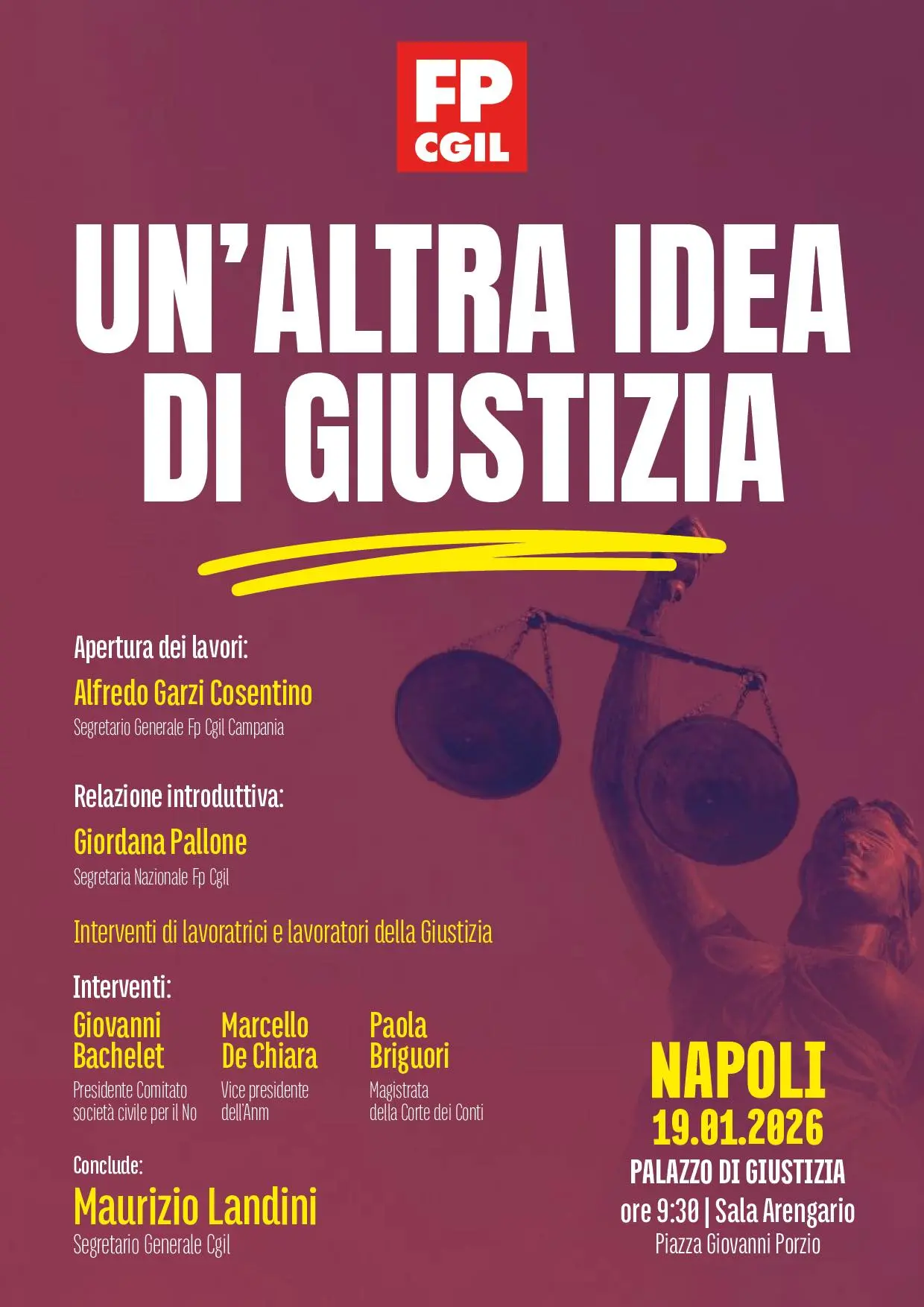 Il segretario generale della Cgil Maurizio Landini concluderà l’iniziativa promossa dalla FP Cgil verso il No al referendum costituzionale. Apertura dei lavori: Alfredo Garzi Cosentino, Segretario Generale Fp Cgil Napoli. Relazione introduttiva: Giordana Pallone, Segretaria Nazionale Fp Cgil. Interventi di lavoratrici e lavoratori della Giustizia, a seguire gli interventi di: Giovanni Bachelet, Presidente Comitato società civile per il No; Marcello De Chiara, Vice presidente dell’Anm e Paola Briguori, Magistrata della Corte dei Conti. Appuntamento a Napoli lunedì 19 gennaio presso il Palazzo di Giustizia, sala Arengario in Piazza Giovanni Porzio, ore 9.30.