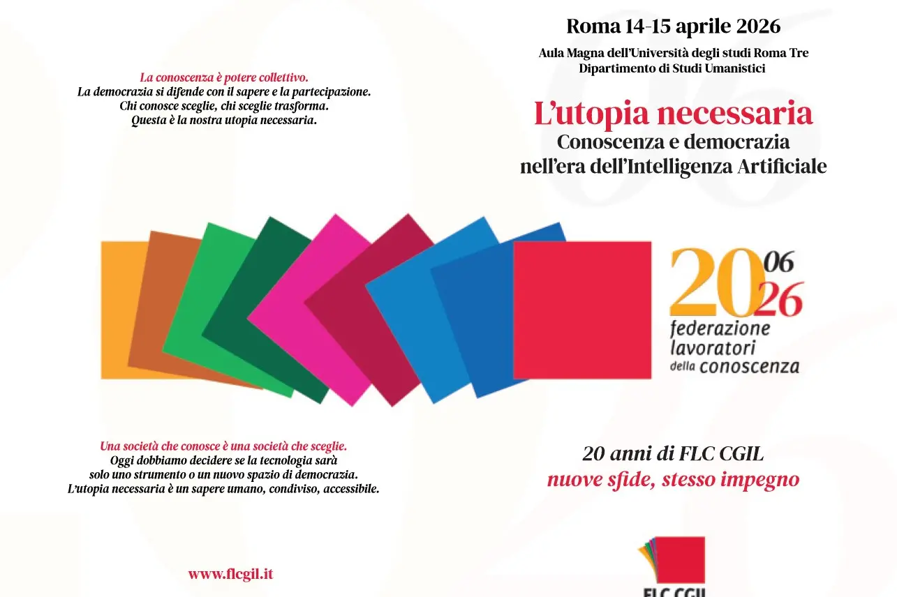Il segretario generale della Cgil Maurizio Landini concluderà i lavori della prima giornata dell’iniziativa promossa dalla Flc Cgil per i 20 anni della categoria ‘L’utopia necessaria. Conoscenza e democrazia nell’era dell’Intelligenza Articiale’. Appuntamento a Roma martedì 14 aprile presso l’Aula Magna dell’Università degli studi Roma Tre, Dipartimento di Studi Umanistici, ore 13.00.