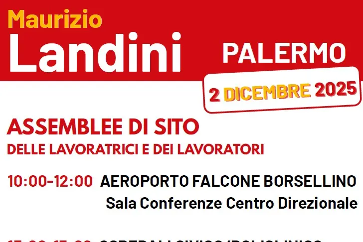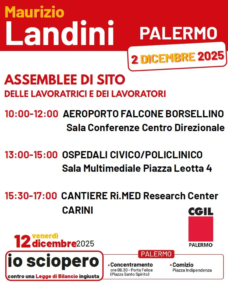 Il segretario generale della Cgil Maurizio Landini sarà a Palermo per partecipare a tre assemblee sindacali in preparazione dello sciopero generale del 12 dicembre contro “una legge Finanziaria ingiusta”. Il programma della giornata prevede una prima assemblea all’aeroporto Falcone e Borsellino, nella sala conferenze del centro direzionale, dalle ore 10.00 alle 12.00. Landini sarà poi a Palermo all’ospedale Civico nella sala Multimediale di Piazza Leotta n.4, dove alle 12.30 prima dell’inizio dell’assemblea con lavoratrici e lavoratori incontrerà la stampa. Alle ore 15.30 il segretario della Cgil si sposterà a Carini dove è prevista l’assemblea al Cantiere Ri.med Research Center.