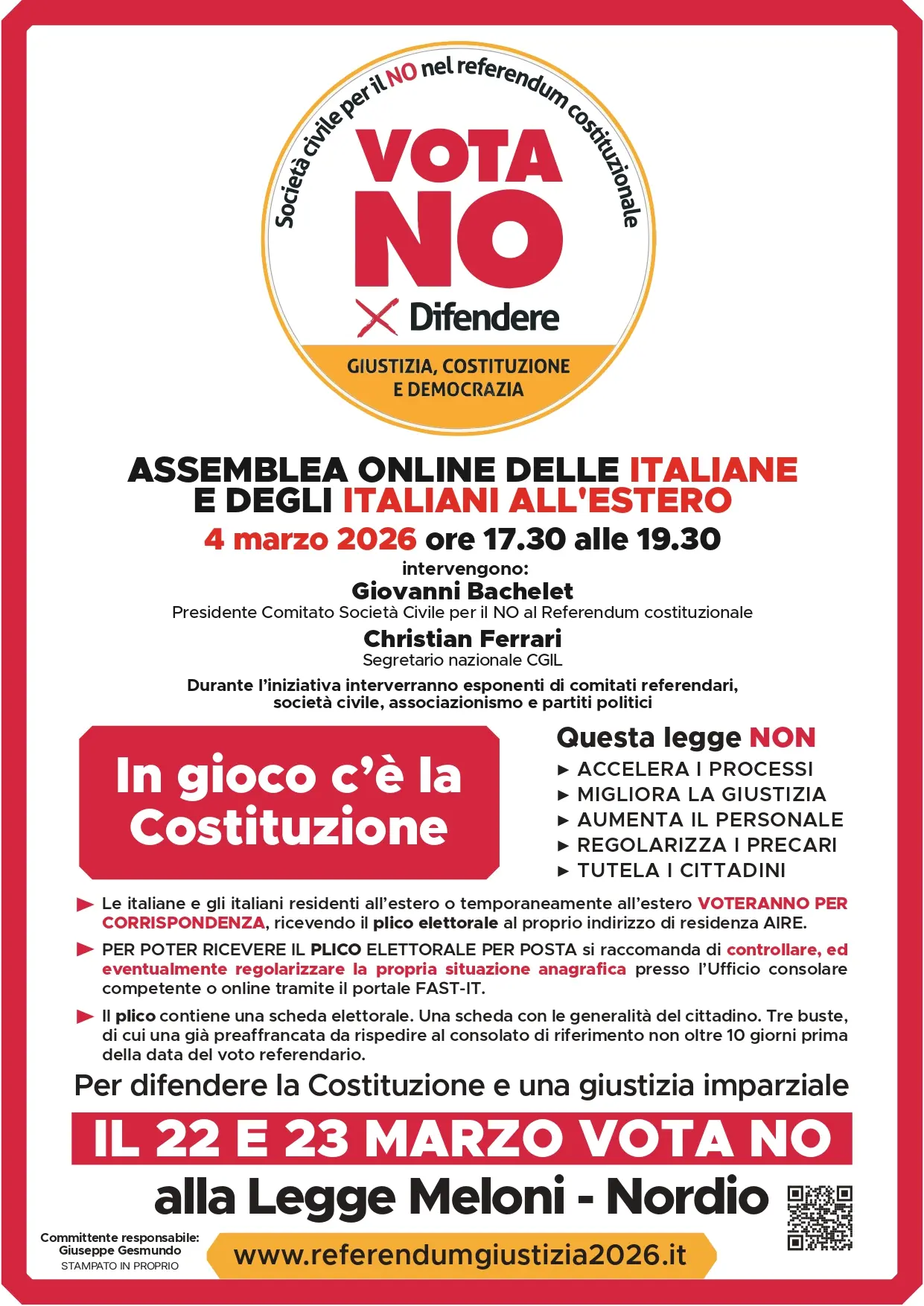 Il segretario confederale della Cgil Christian Ferrari insieme a Giovanni Bachelet, Presidente del Comitato della società civile per il No al referendum costituzionale, parteciperà all’assemblea del Coordinamento delle italiane e degli italiani all’estero per la chiusura della campagna referendaria. Durante l'iniziativa sono previsti interventi di esponenti di comitati referendari, società civile, associazionismo e partiti politici. Appuntamento online mercoledì 4 marzo, ore 17.30.