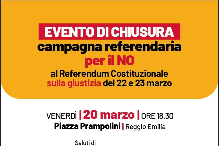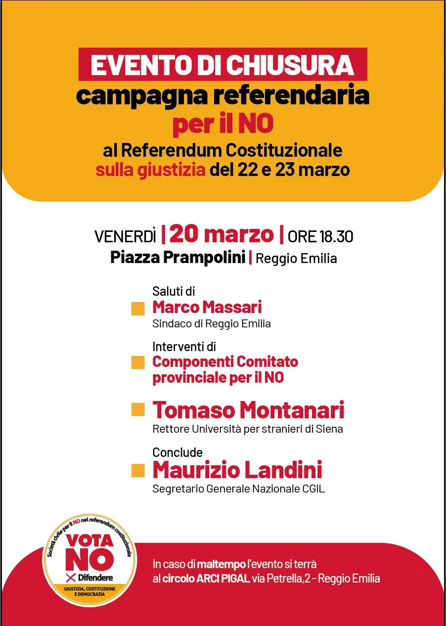 Il segretario generale della Cgil Maurizio Landini interverrà all’evento per la chiusura della campagna per il NO al referendum costituzionale sulla giustizia del 22 e 23 marzo. Appuntamento venerdì 20 marzo a Reggio Emilia in Piazza Prampolini, ore 18.30.