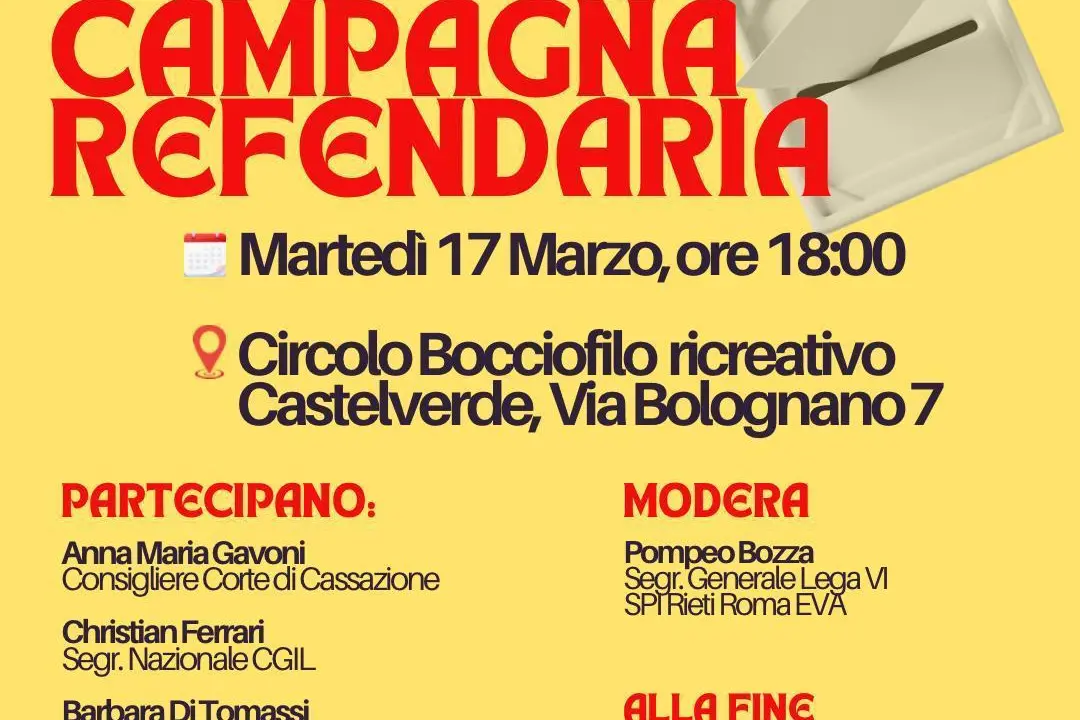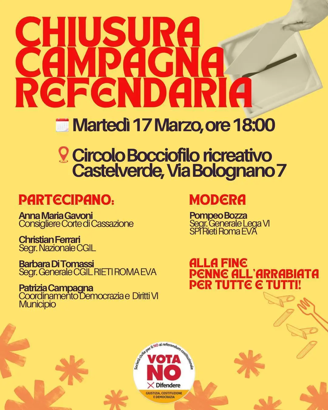 Il segretario confederale della Cgil Christian Ferrari interverrà all’iniziativa per la chiusura della campagna referendaria per il NO al referendum costituzionale sulla giustizia del 22 e 23 marzo. Appuntamento martedì 17 marzo a Castelverde presso il Circolo Bocciofilo ricreativo in via Bolognano n.7, ore 18.00.