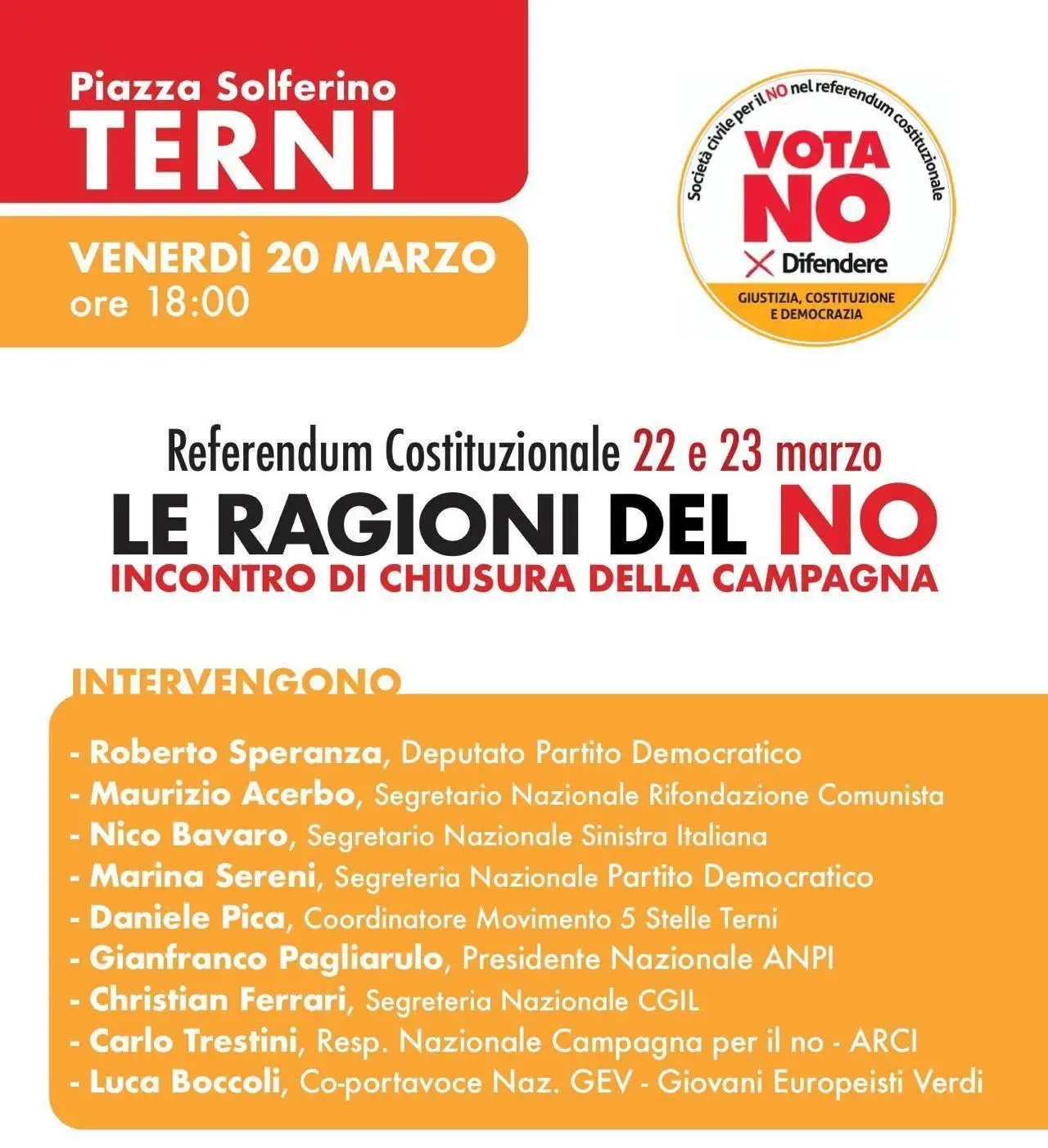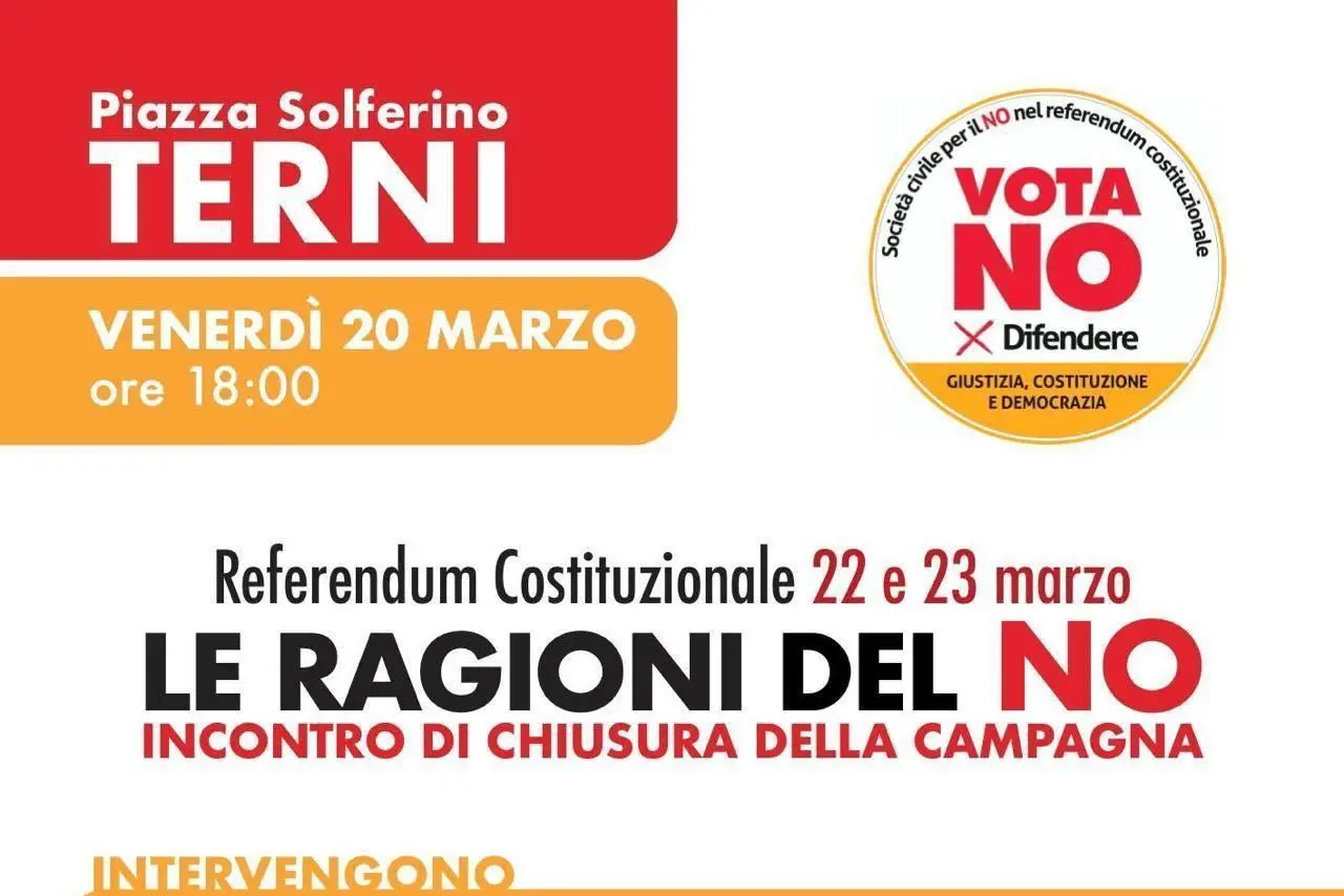 Il segretario confederale della Cgil Christian Ferrari interverrà all’evento di chiusura della campagna per il NO al referendum costituzionale sulla giustizia del 22 e 23 marzo. Appuntamento a Terni in Piazza Solferino, ore 18.00