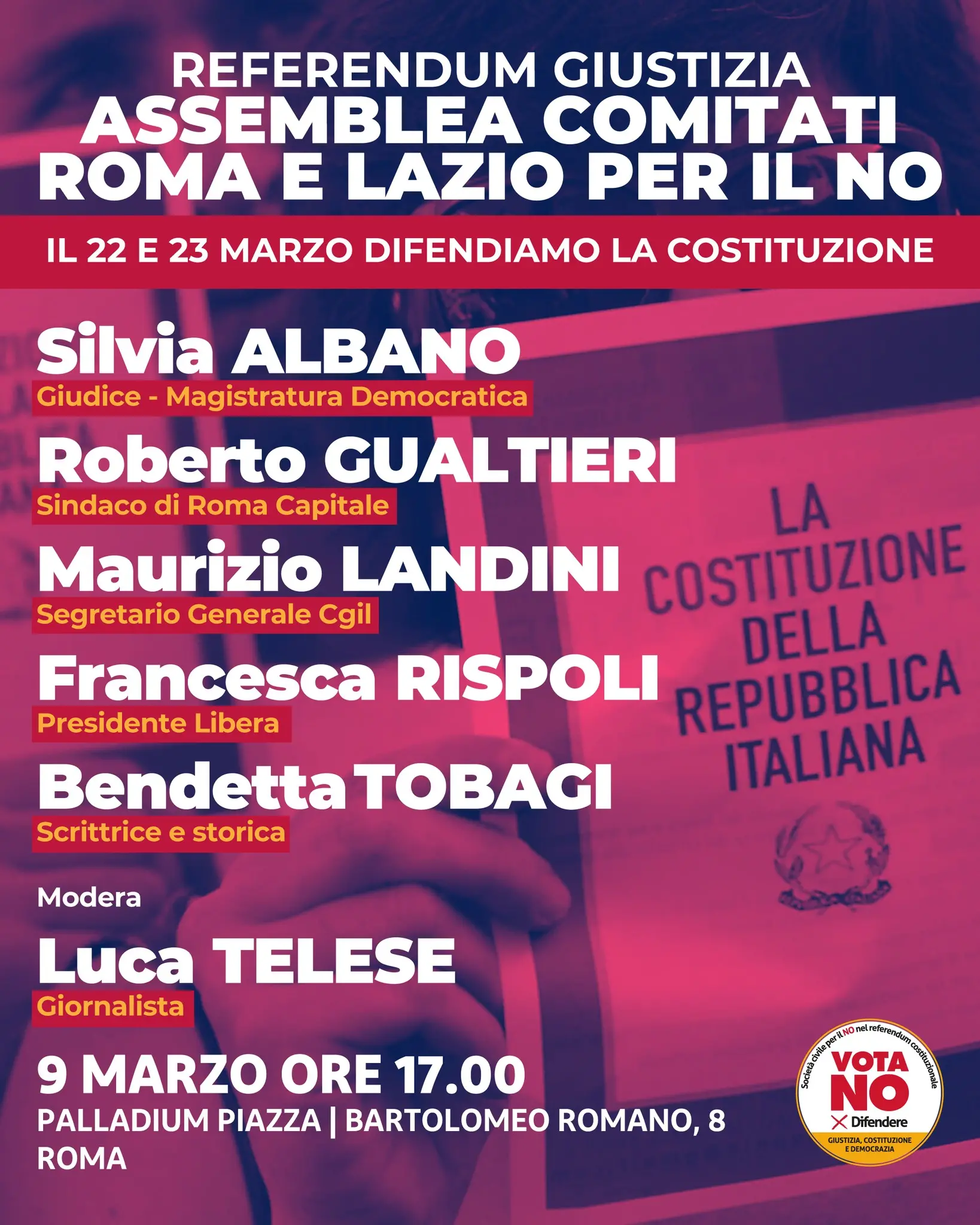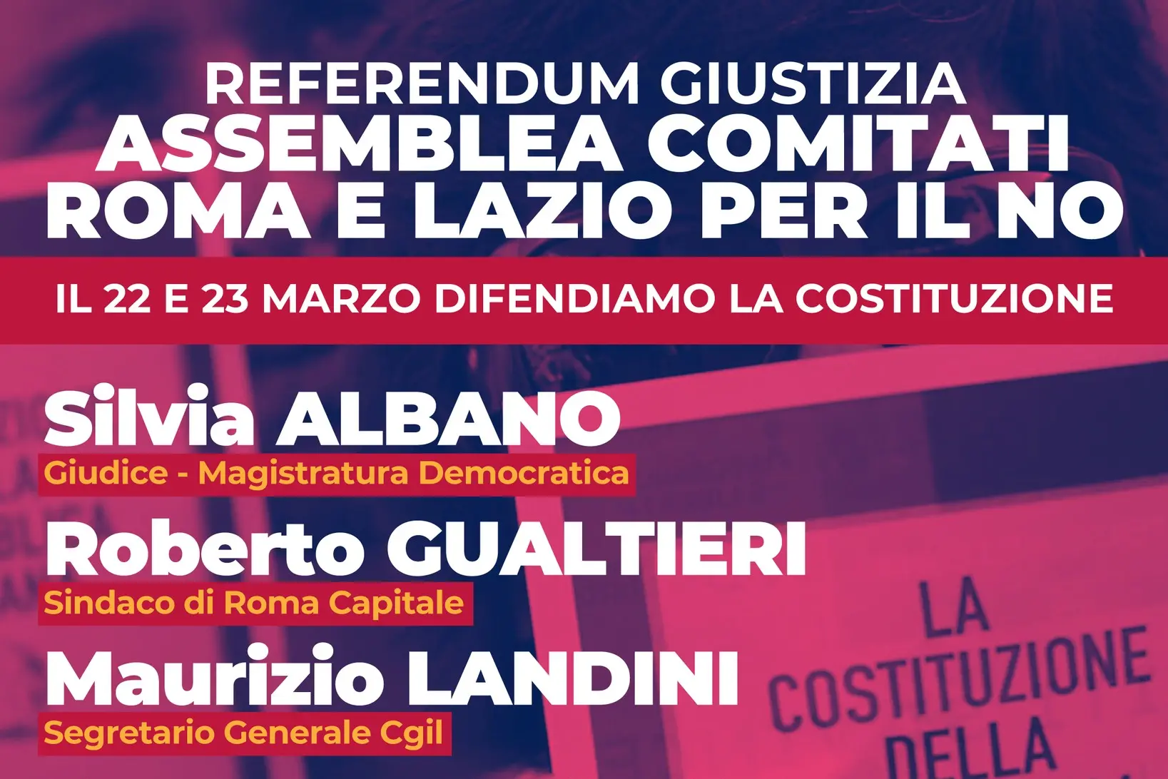 In vista del referendum sulla giustizia del 22 e 23 marzo, il Comitato della Società Civile di Roma e Lazio per il NO promuove una grande assemblea pubblica per informare, discutere e mobilitare le cittadine e i cittadini a difesa della Costituzione e della democrazia, respingendo la Legge Nordio - Meloni.