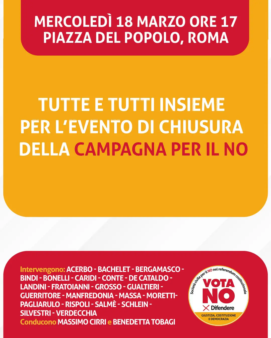 L’appuntamento dunque è per le 17.00 a Roma, in Piazza del Popolo, per un pomeriggio di unità, impegno, parole e qualche momento di leggerezza: per affermare ancora una volta forte e chiaro il nostro No nel referendum del 22 e 23 marzo in difesa della giustizia, della Costituzione e della democrazia.