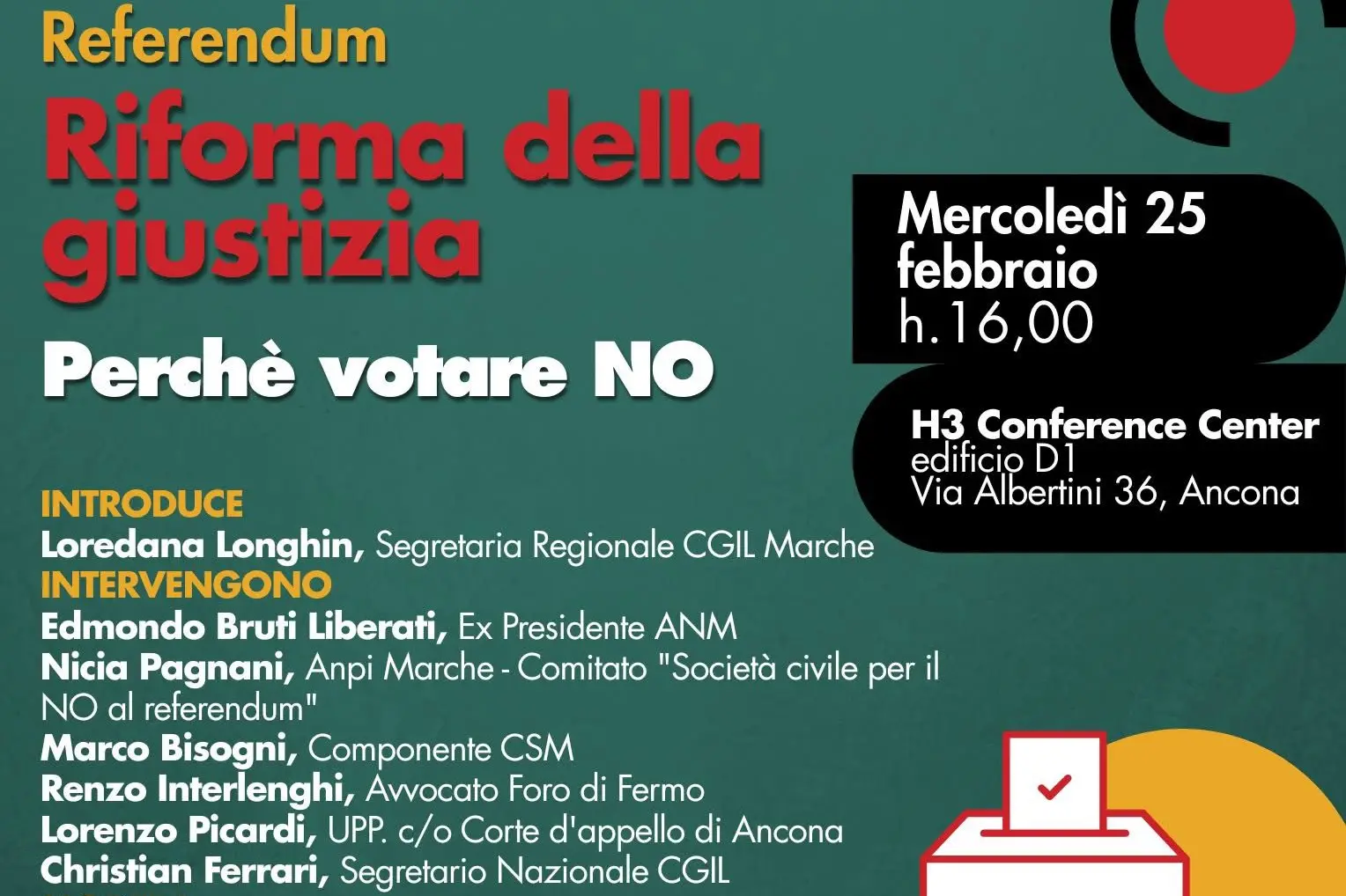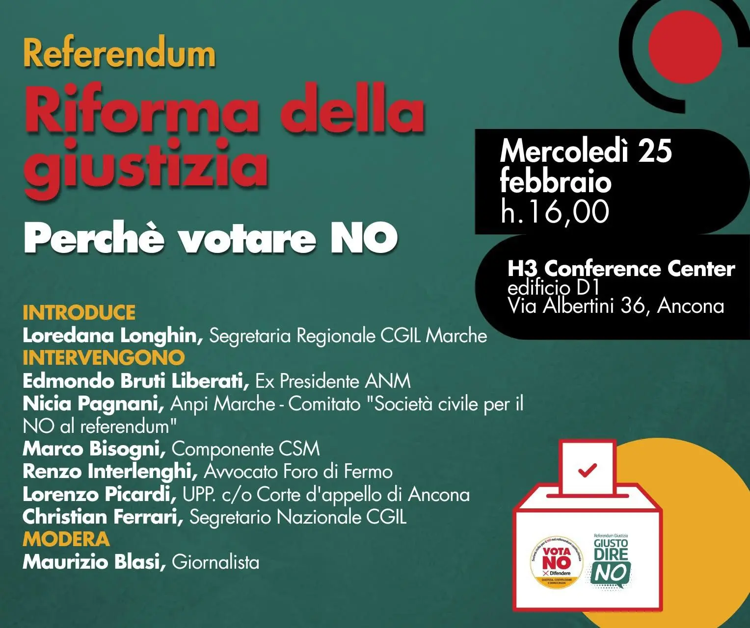 Il segretario confederale della Cgil Christian Ferrari interverrà all’iniziativa ‘Referendum riforma della giustizia. Perché votare NO’ in programma ad Ancona mercoledì 25 febbraio presso H3 Conference Center, edificio D1, in via Albertini n.36, ore 16.00.