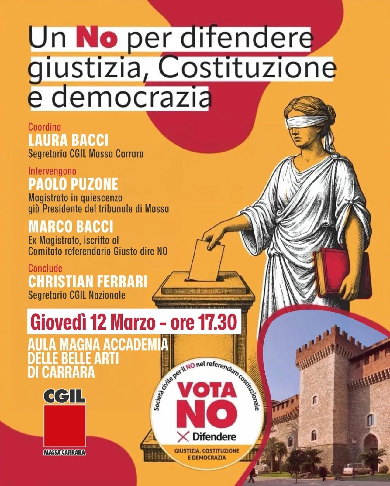 Il segretario confederale della Cgil Christian Ferrari concluderà l’iniziativa ‘Un NO per difendere giustizia, Costituzione e democrazia’. Appuntamento giovedì 12 marzo presso l’aula magna dell’Accademia delle Belle Arti di Carrara, ore 17.30.