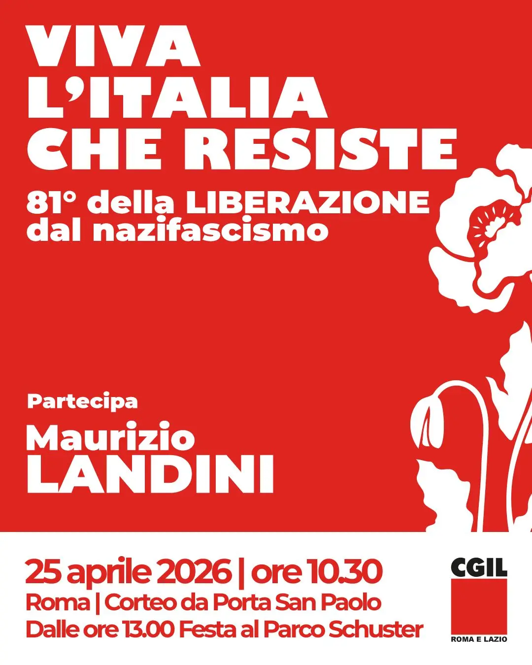 Roma, 21 aprile - In occasione dell’81° anniversario della Liberazione dal nazifascismo, il segretario generale della Cgil, Maurizio Landini, parteciperà alla manifestazione che si terrà a Roma il 25 aprile.
